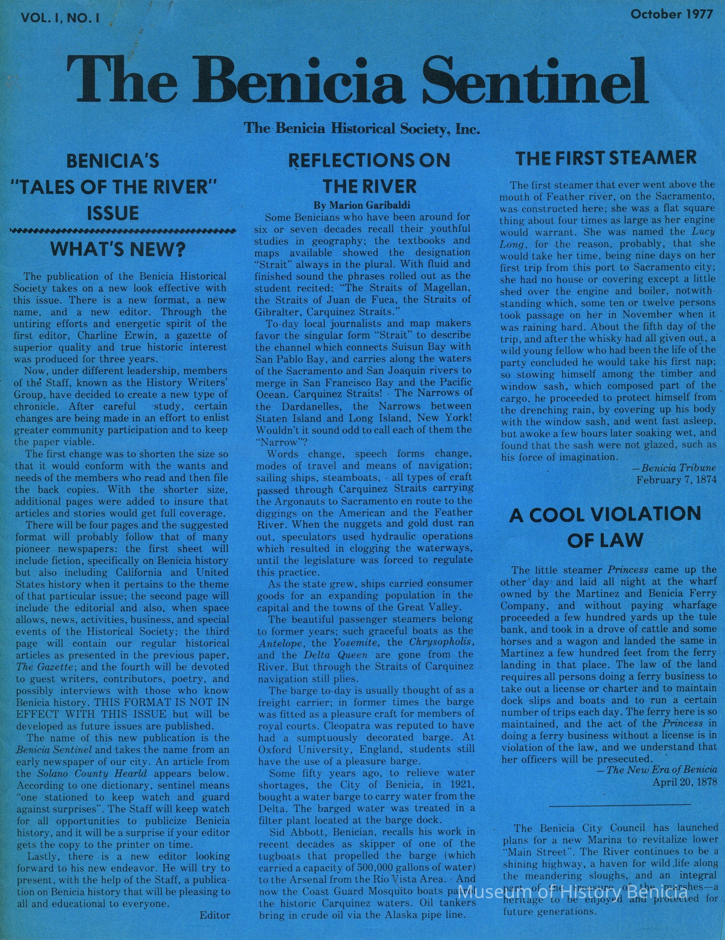The Benicia Historical Society, Inc. Vol. I, No. 1, October 1977