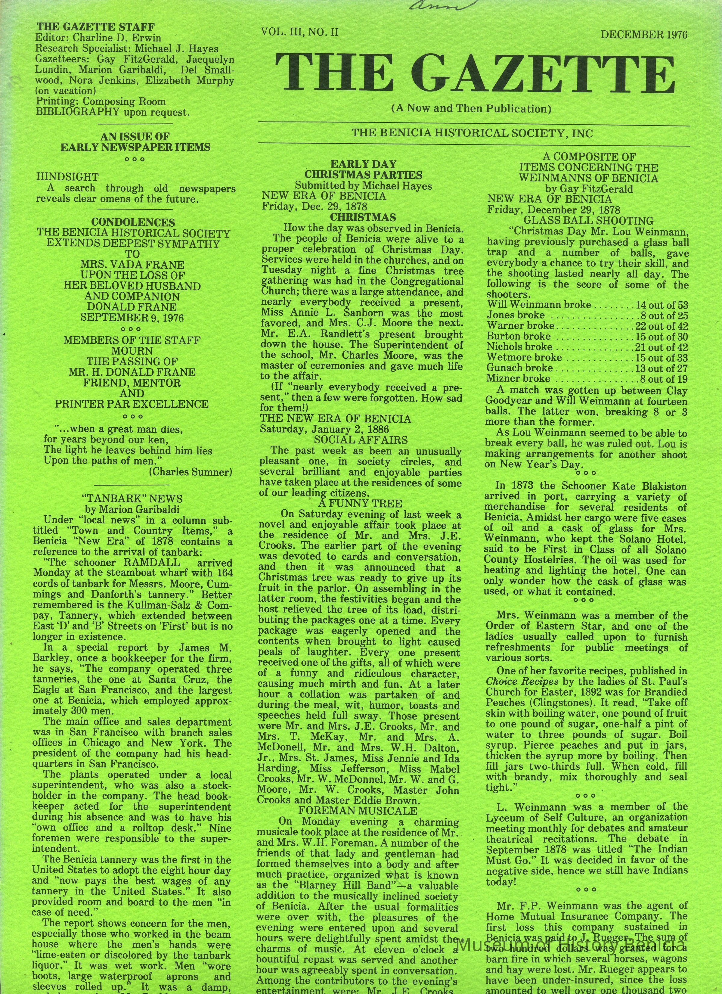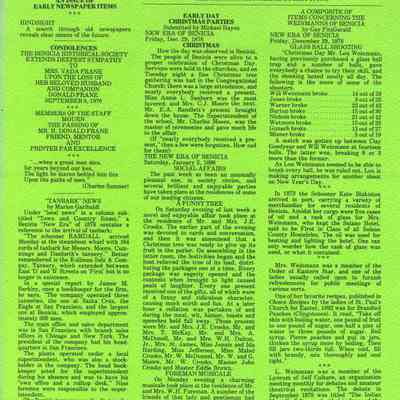It is "An Issue of Early Newspaper Items": "Tanbark News" 1878; Early Day Christmas Parties" 1878; "A Composite of Items Concerning the Weinmanns of Benicia" 1878; "Home at Last, St. Augustine College" 1882; "Benicia 1976 - A window from St. Augustine's was sold to Frieda Lundin"; "An Advertisement by Charles Durner about the many items for sale at his store" 1880; "Theatrical" 1873; "Sheet and Pillow-Care Party" 1874.Collection