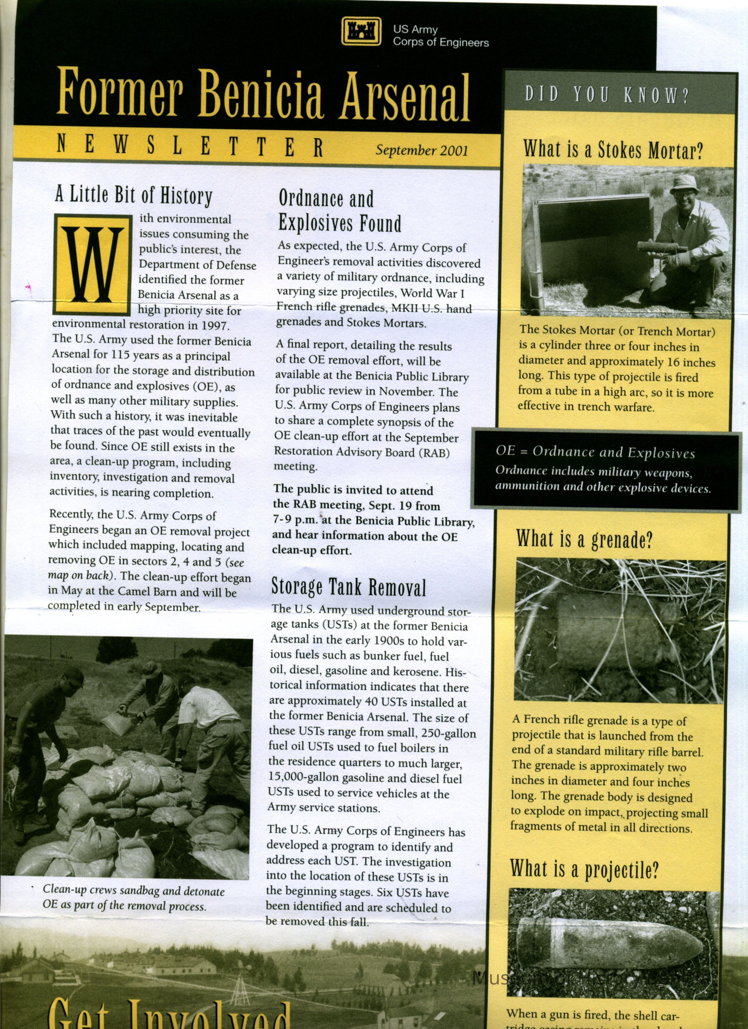 This is a newsletter for the "Former" Benicia Asenal. It is dated 09/2001 and talks of the cleanup activities being done by the Army. It mentions unexploded ordnance, fuel storage tanks, mortars, etc.Collection
