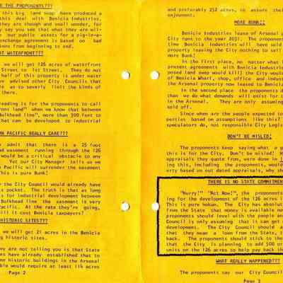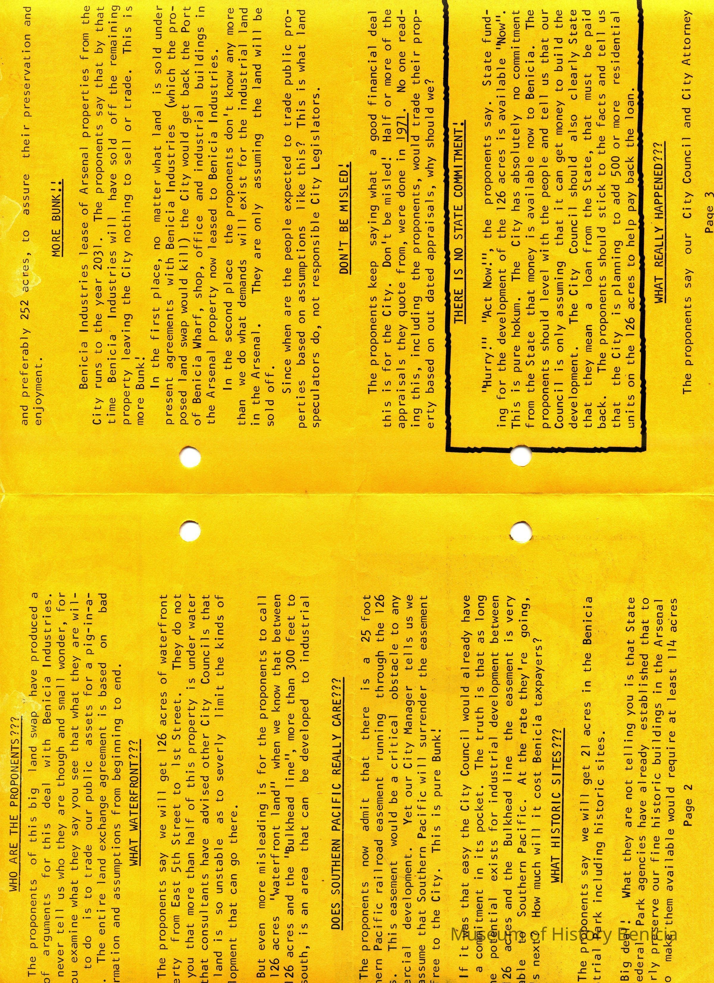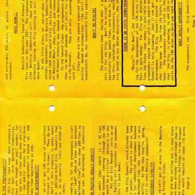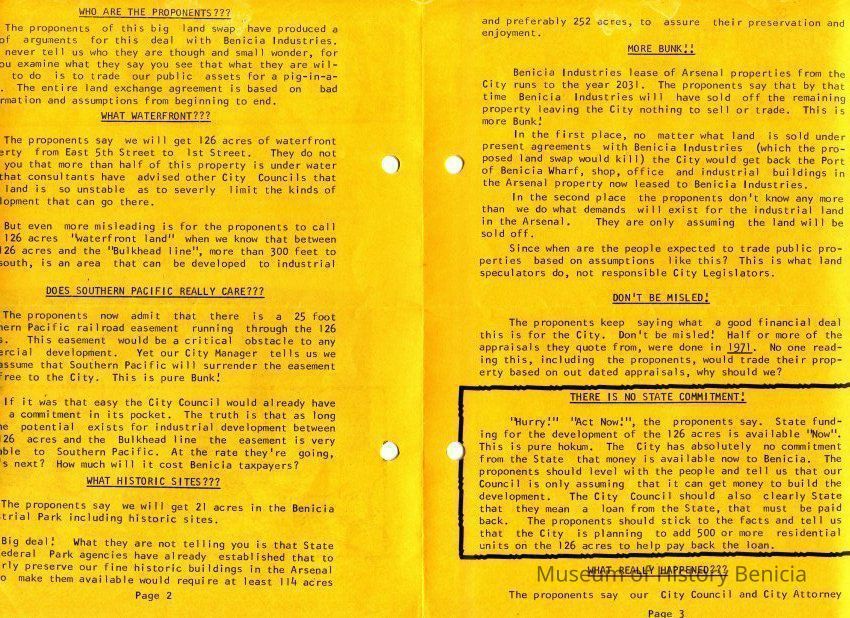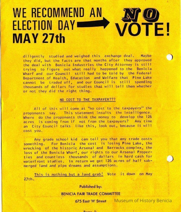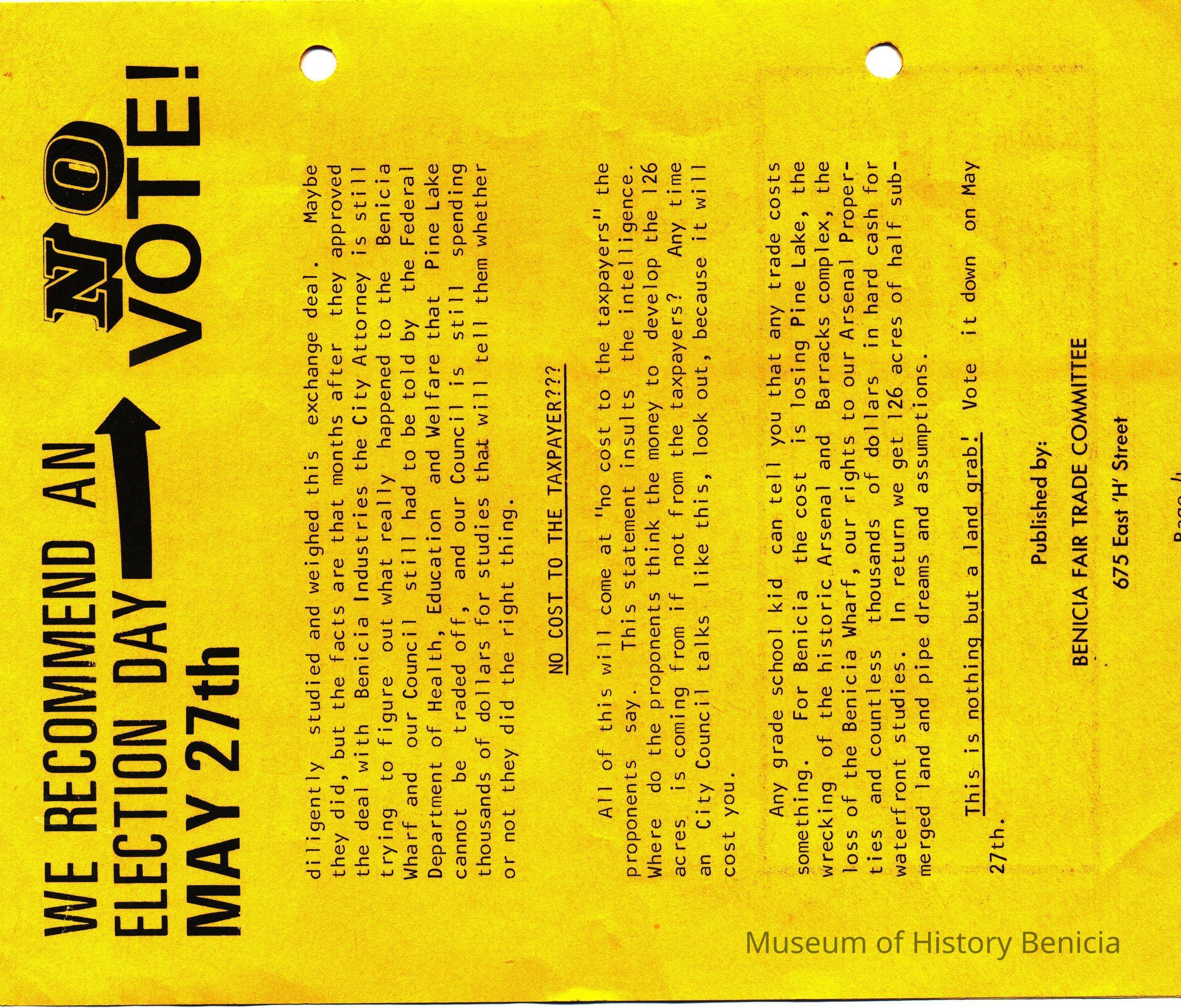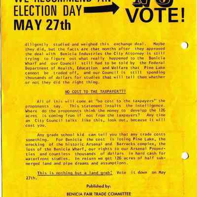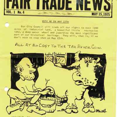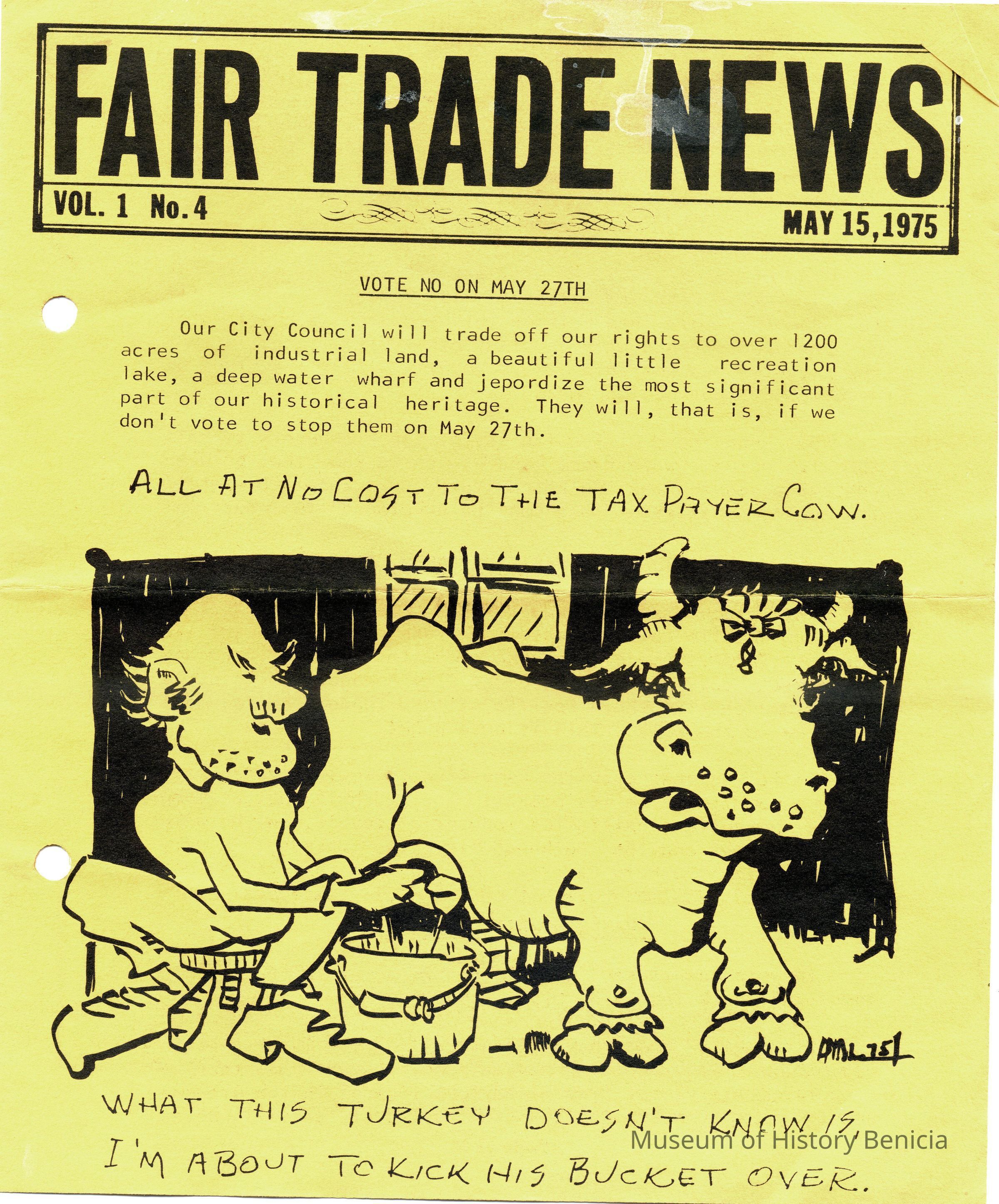 This is a pamphlet called the Fair Trade News dated 05/15/1975. It was written by opponents of the City's trade of the Industrial Park lands for the control of Benicia waterfront property. The top story is that residents of Benicia should vote "NO" in the election on May 27th. (The election ended in favor of the land swap - 1,459 yes and 1191 no.Collection