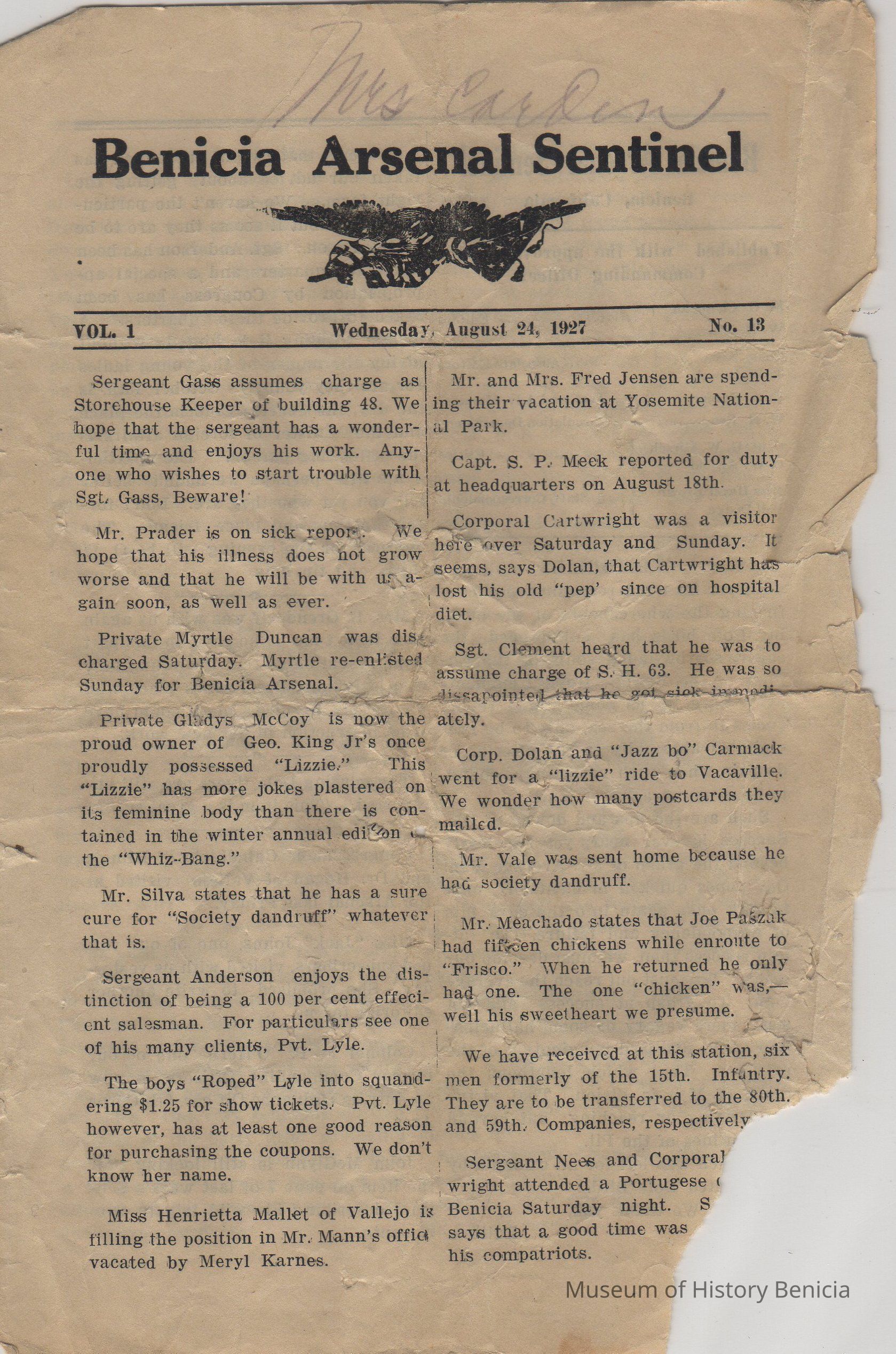 Folded white paper-4 pages-printed in black "Benicia Arsenal Sentinel/ vol. 1, no. 13, Wednesday August 24, 1927" "Mrs. Carden" in pencil top front.Collection