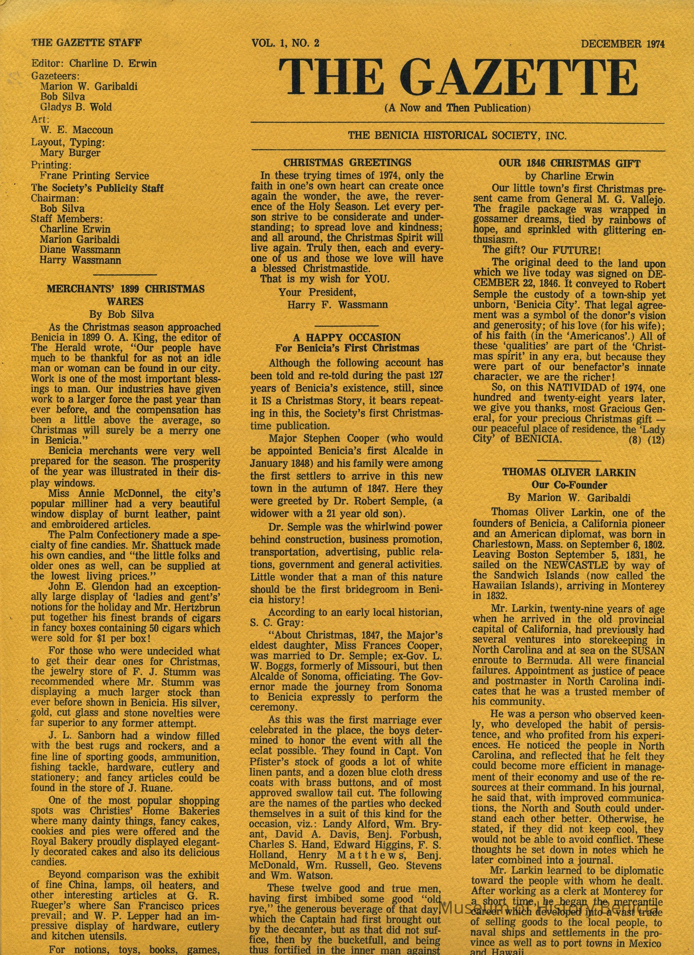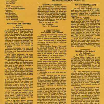 Items: "Merchants' 1899 Christmas Wares"; "A Happy Occasion for Benicia's First Christmas"; "Our 1846 Christmas Gift"; "Thomas Oliver Larkin, Our Co-Founter", "The Railroad in Benicia"; "An 1887 Menu for Christmas Dinner"; "A Sad Christmas - 1881".Collection