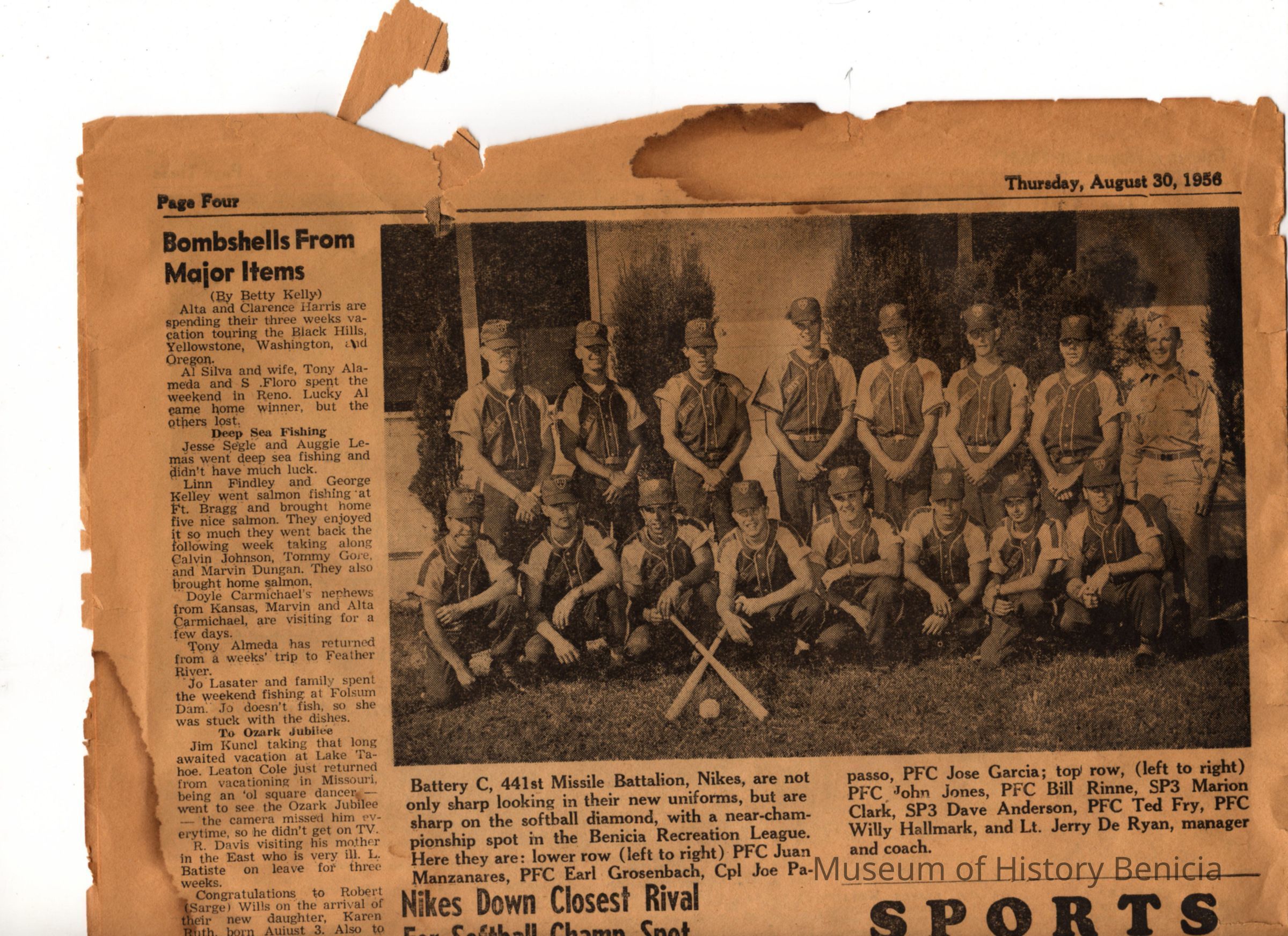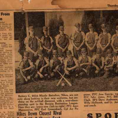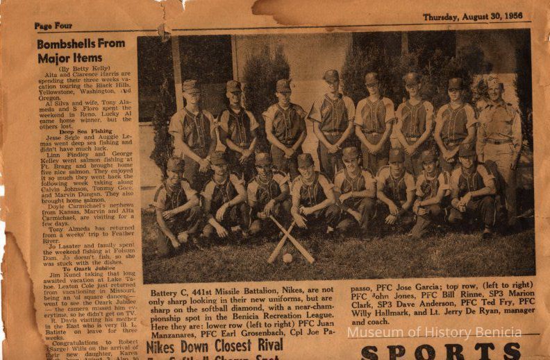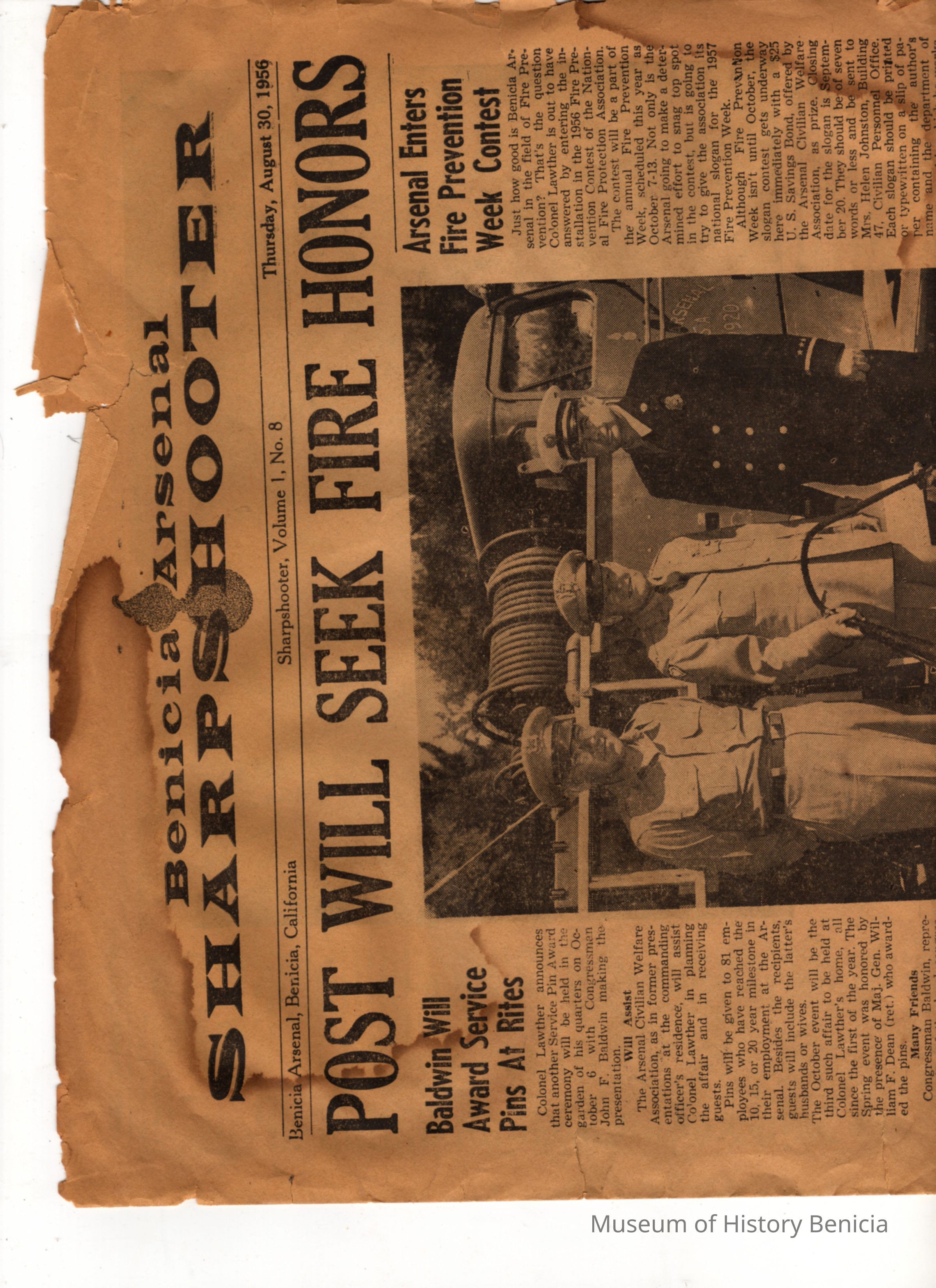 sample articles: Fire Prevention Week contest (with photo); Congressman Baldwin to visit; apprentice classes; retirement act provisions covered; various assignments/reassignments and promotions of employees (some photos); classified ads; sports (photo of Battery C, 441st Missle Battalion Nikes)