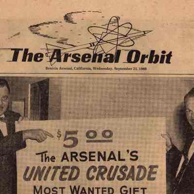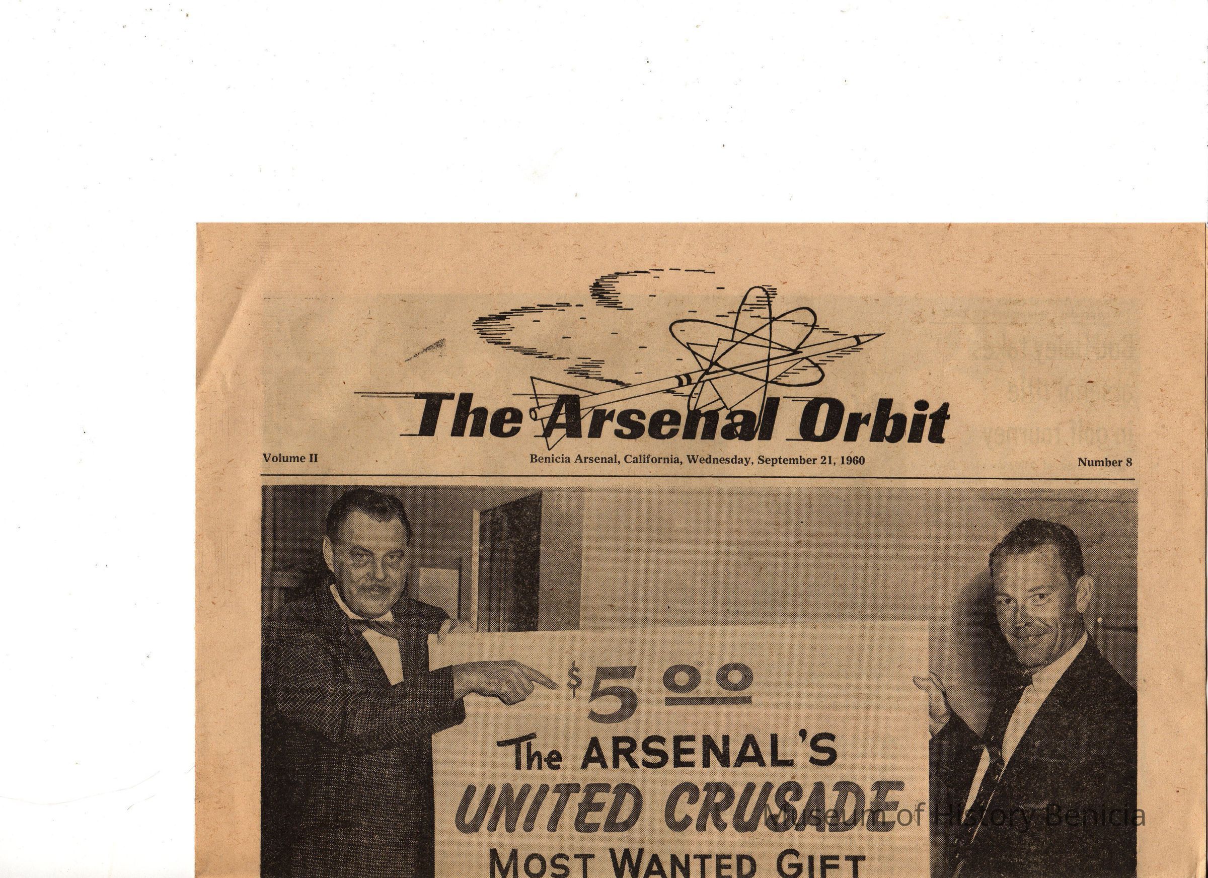 newsletter: "The Arsenal Orbit" dated September 21, 1960, Volume II Number 8; potographs and news items about the Arsenal and its employees - not printed at government expense;