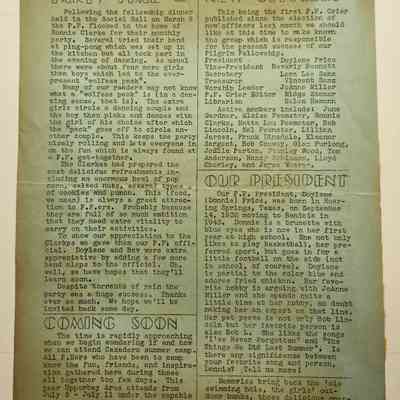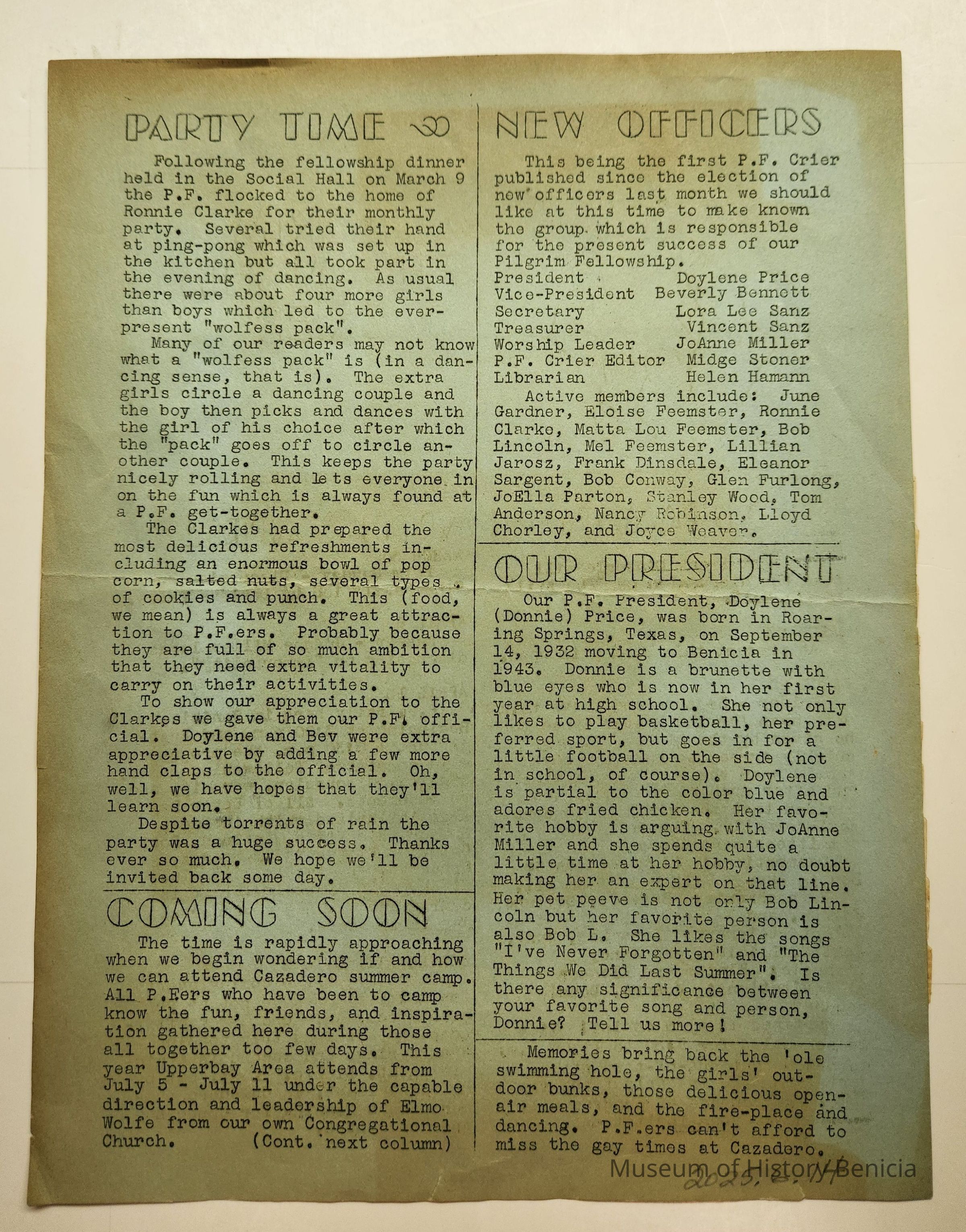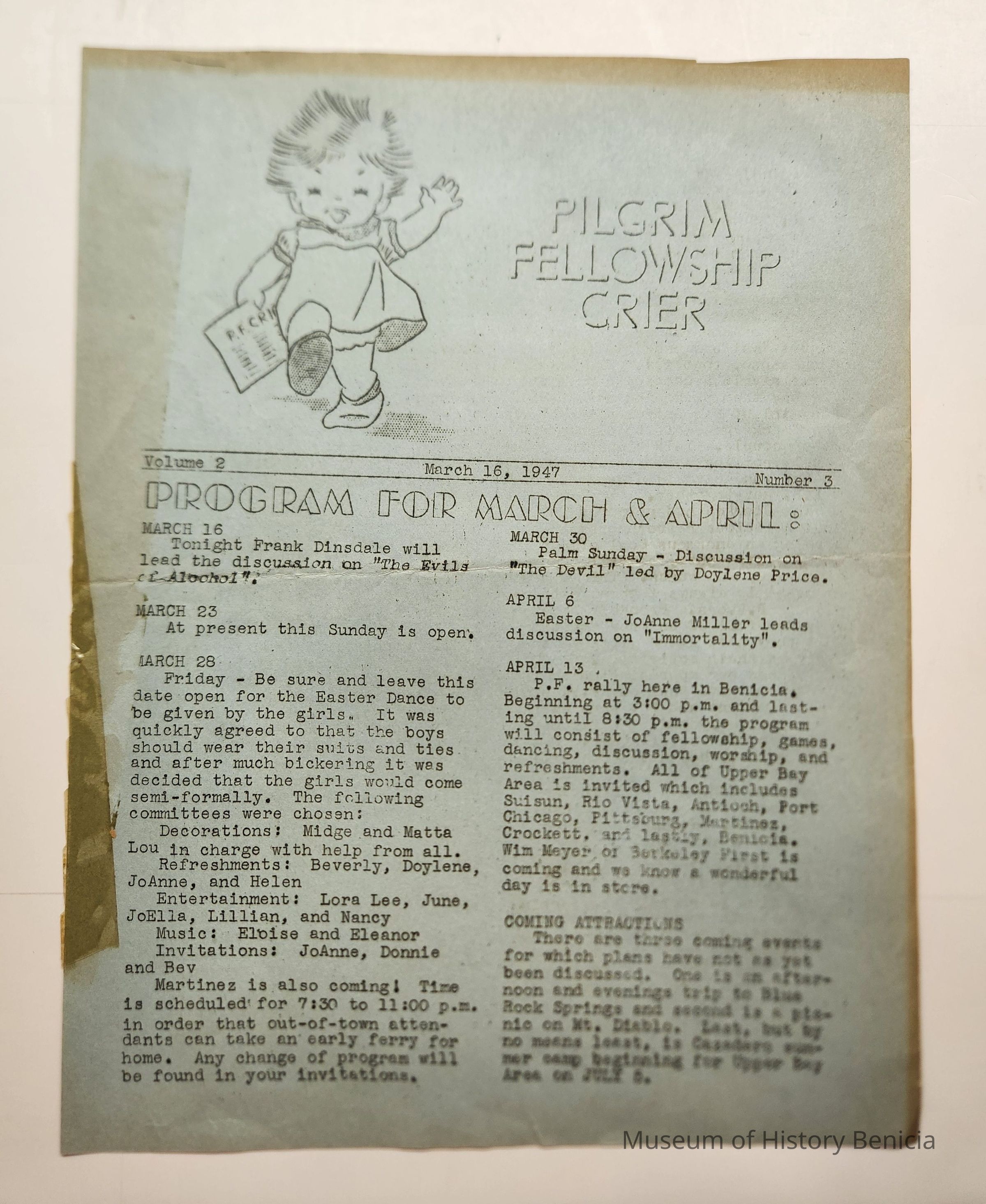 A newsletter from a group at the Community Congregational Church, The Pilgrim Fellowship. It is a group for young people. The newsletter is mimeographed on both sides of blue paper. The name is "Pilgrim Fellowship Crier". It is Volume 2, March 16, 1947, Number 3. It contains information for the members for their programs in March and April. Samples of articles: Sunday group discussions, dances, trips (to Blue Rock Springs and picnic at Mt. Diablo), rally with groups from other cities, summer camp sign-ups, list of new officers and a profile of the group's president, Doylene Price. Some of the active members were June Gardner, Eloise Feemster, Ronnie Clarke, Matta Lou Feemster, Bob Lincoln, Mel Feemster, Lilliam Jarosz, Frank Dinsdale, Eleanor Sargent, Bob Conway, Glen Furlong, Joella Parton, Stanley Wood, Tom Anderson, Nancy Robinson, Lloyd Chorley, Joyce Weaver, Doylene Price, Beverly Bennett, Lora Lee Sanz, Vincent Sanz, JoAnne Miller, Midge Stoner, and Helen Hamann.Collection