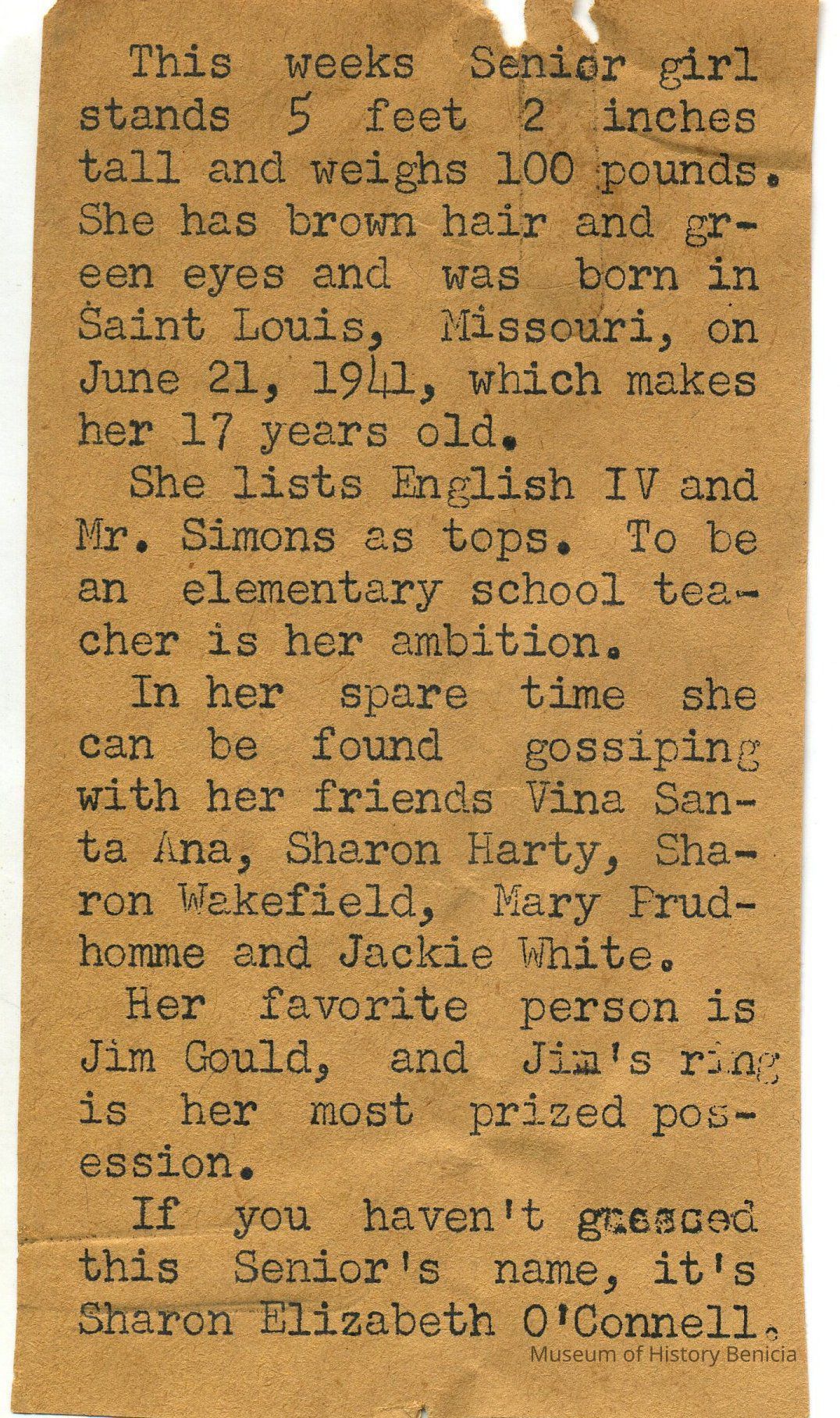 Newspaper Article - Senior Biography of Sharon O'Connell which appeared in the Benicia High School weekly newspaper, The Prowling Panther, Vol. XIX, No. 26, April 10, 1959 on page 4, in the Seniors' Corner in the Panther Features;