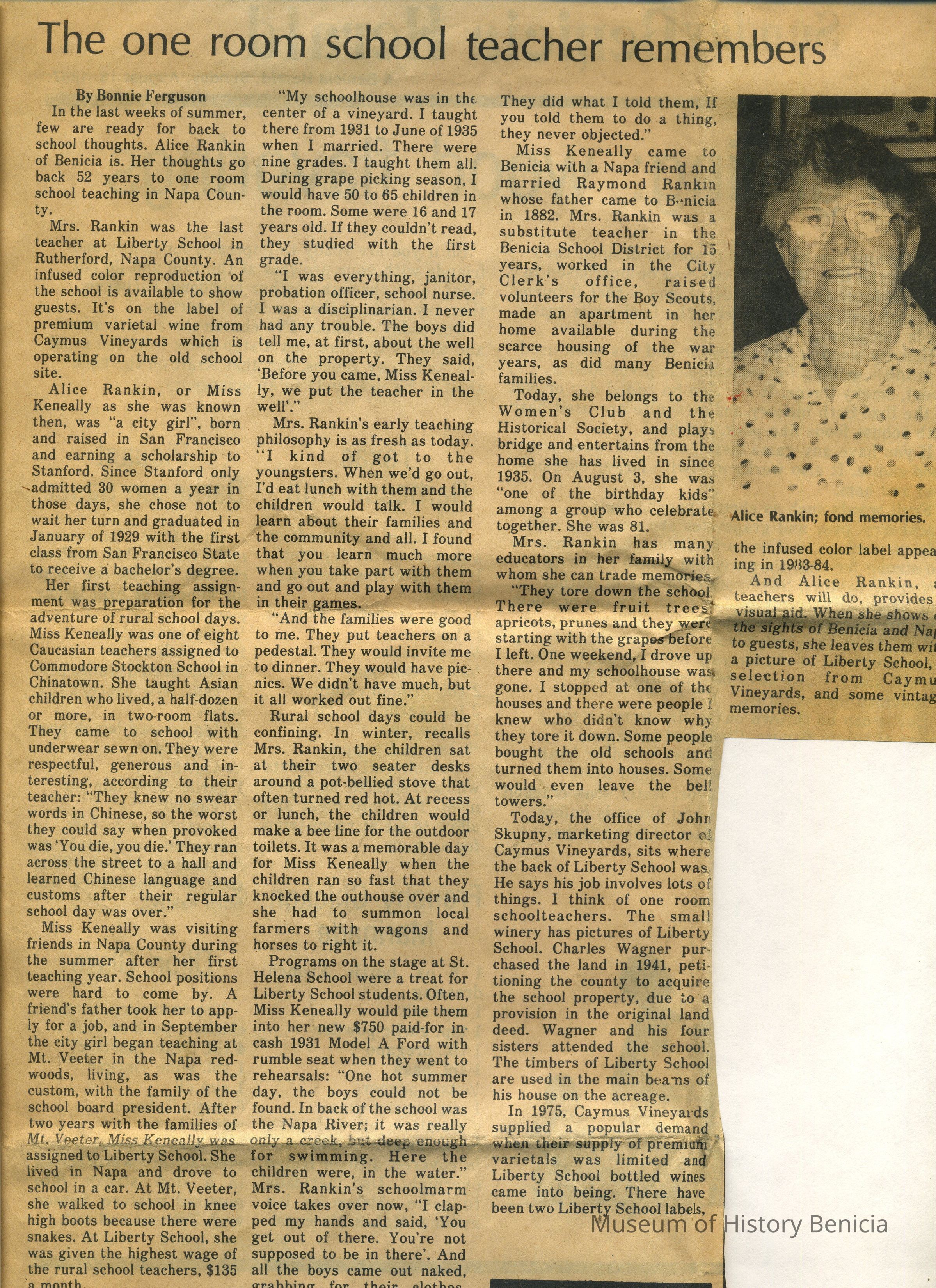 Newspaper Article and Photograph - recounts the memories of Alice Rankin when she was a teache in a one-room school; appeared in the Benicia Herald on Sunday, August 16, 1987;