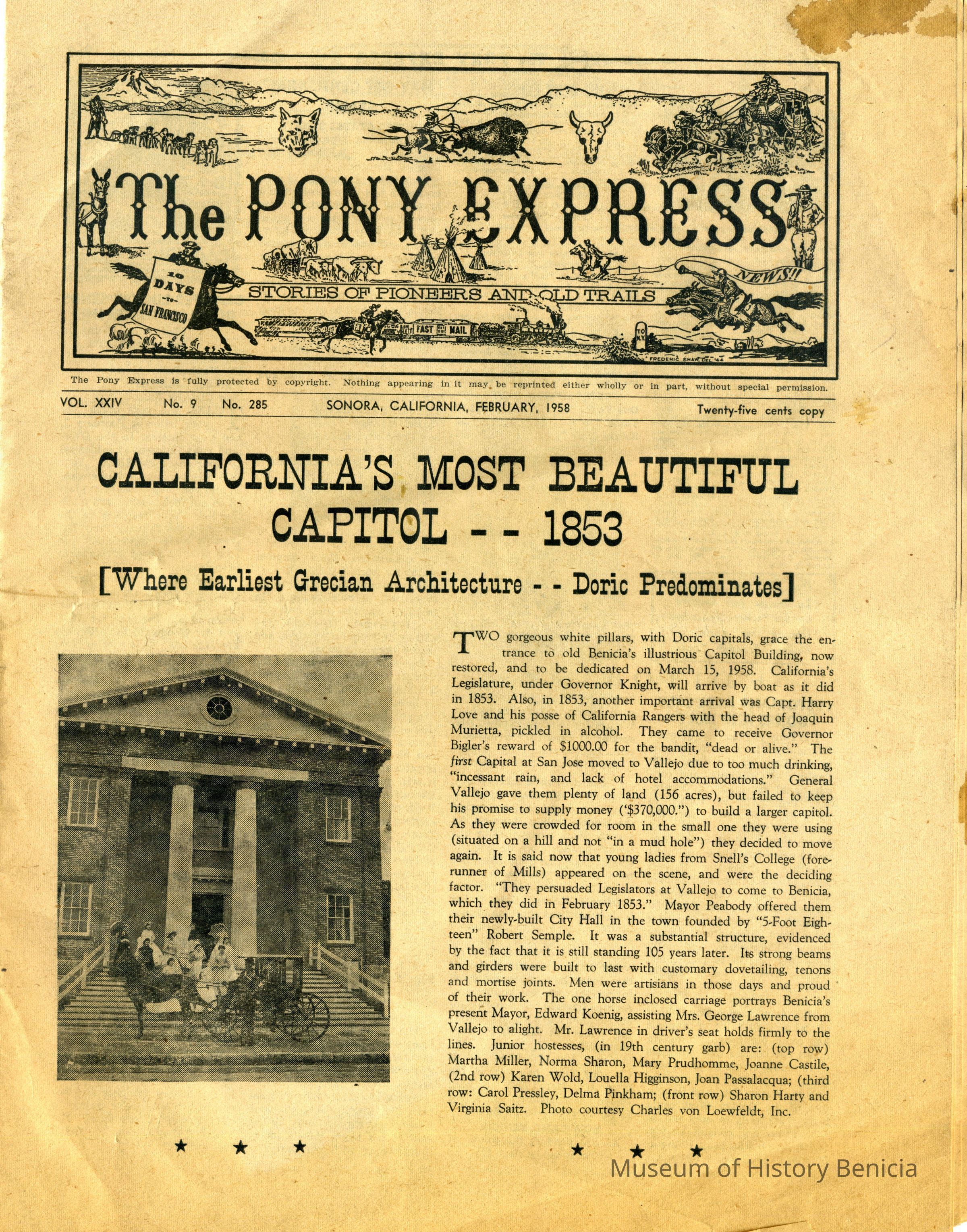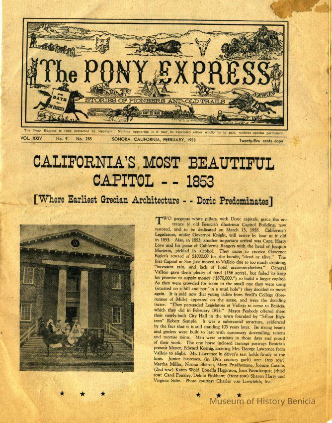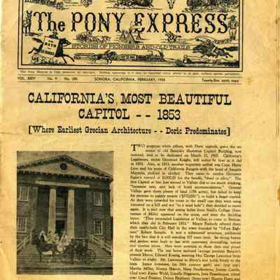 This is the newspaper "The Pony Express" from Sonora California on February, 1958. It covers the restoration of the State Capitol at Benicia.Collection