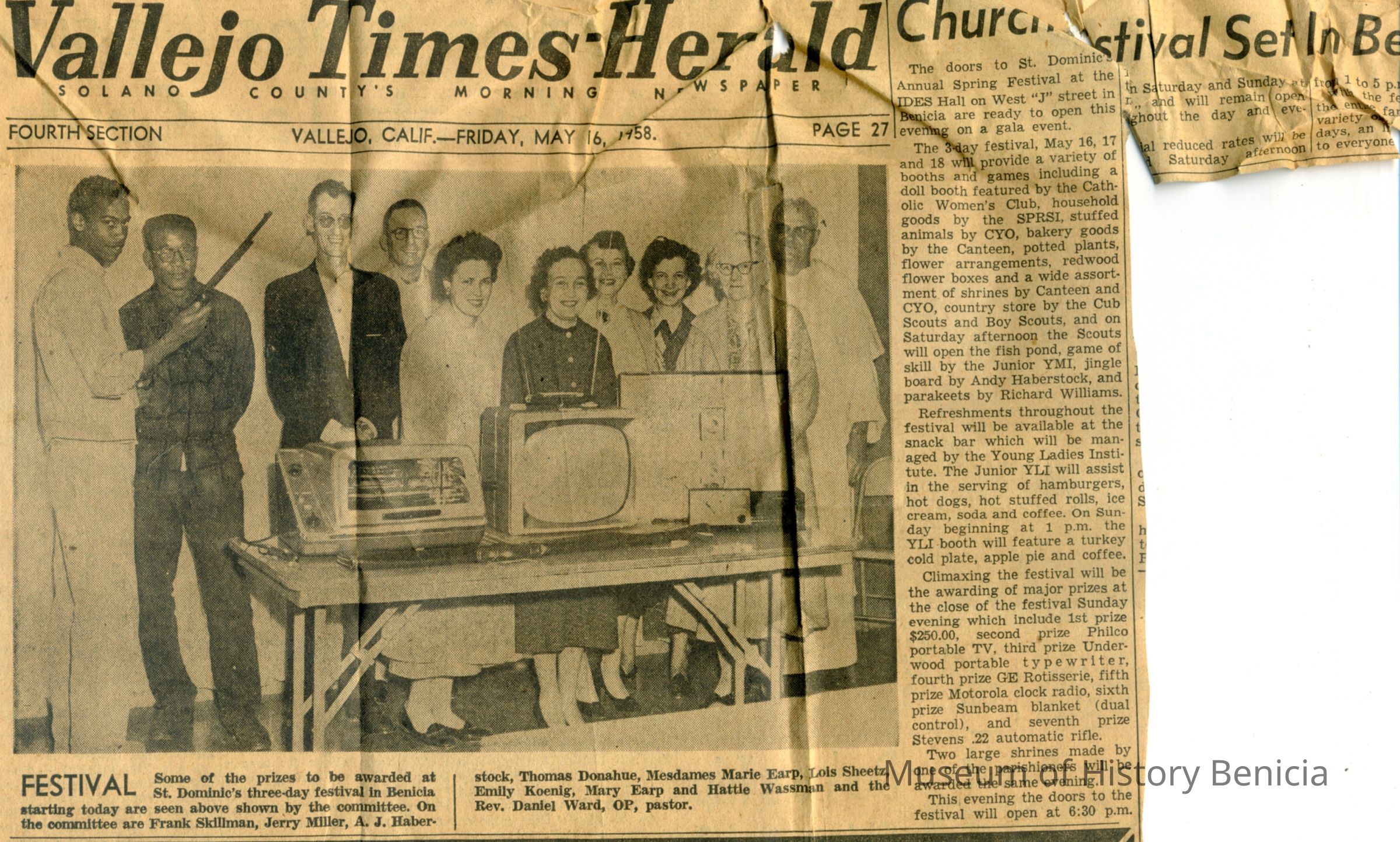 This is a newspaper article on a church festival and drawing at St. Dominic's Annual Spring Festival. At the conclusion of the festival prizes will be awarded. The photo with the article shows some of the prizes. The people in the photo are committee members: