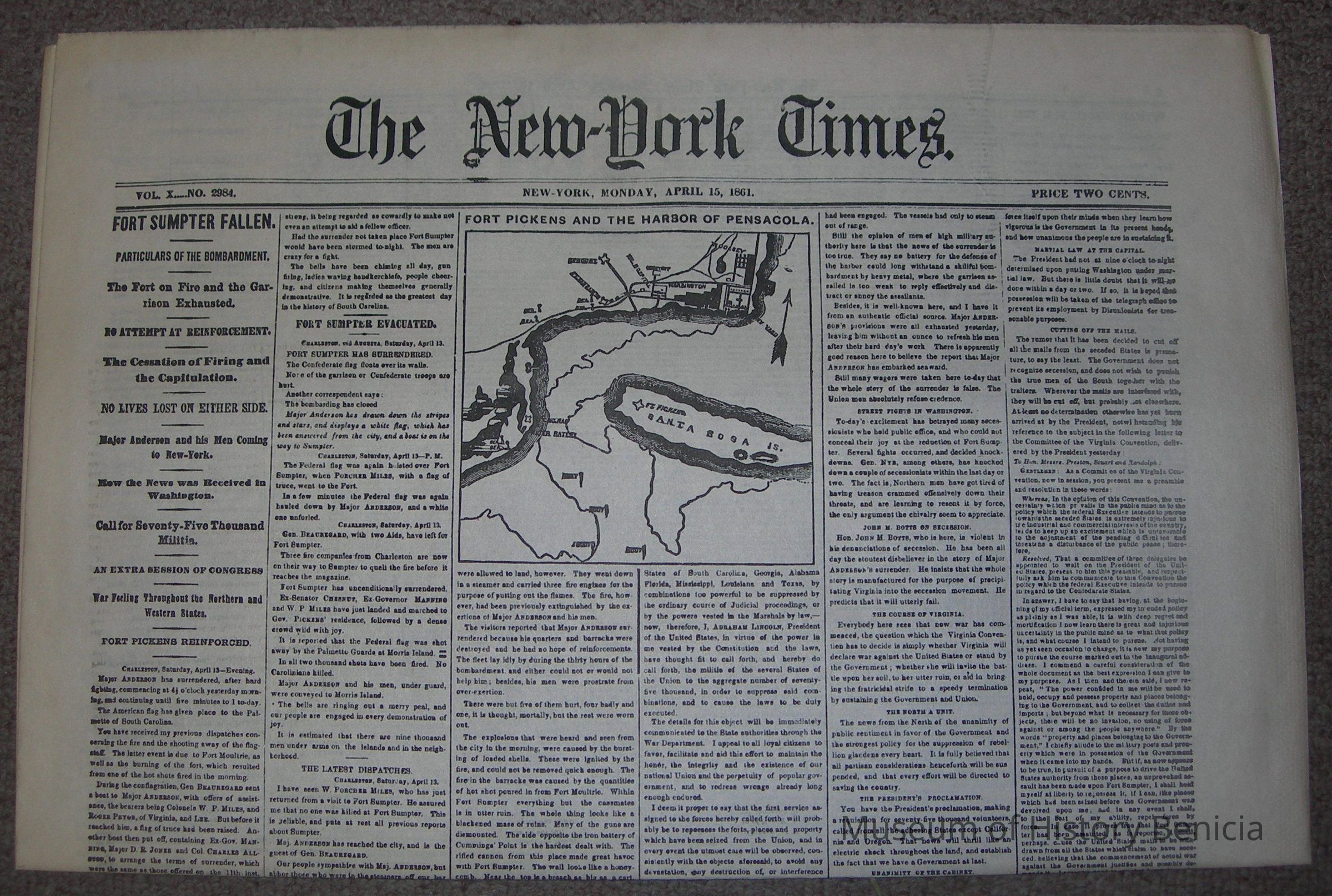 Reproduction The New York Times Monday, April 15, 1861- Vol. X - No. 2984; price 2 cents "Fort Sumpter Fallen"