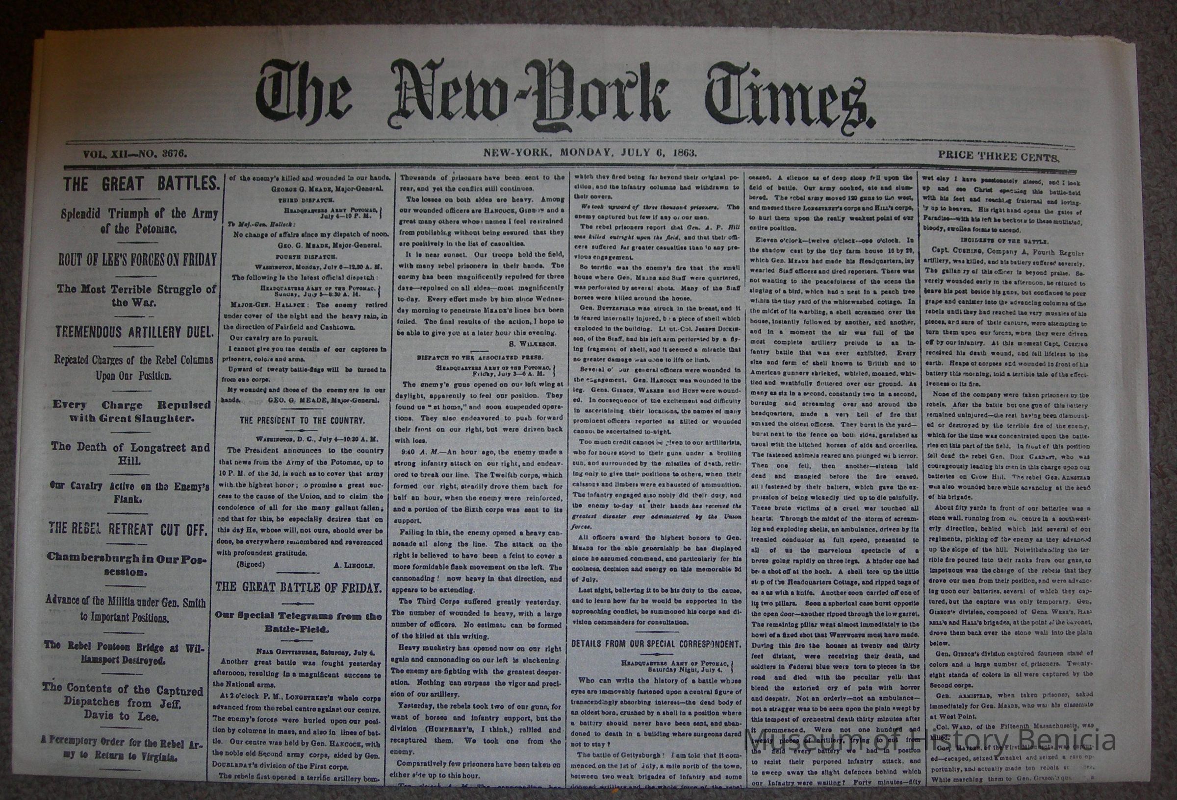 Reproduction The New York Times Monday, July 6, 1863 - Vol. XII - No. 3676; price 3 cents "The Great Battles"