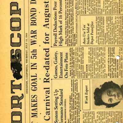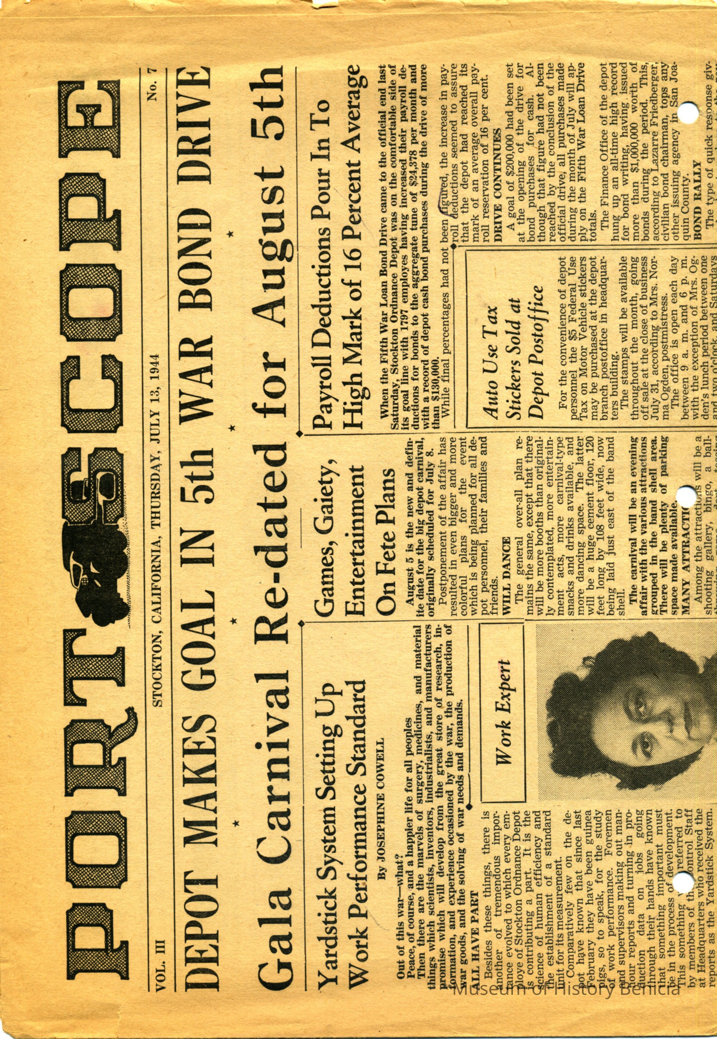 This is a newspaper called "Port Scope" from Stockton, Ca dated 0713/1944. The front page has articles about the Stockton Depot's War Bond Drive, a Depot carnival, payroll deductions for War Bonds, and an article by Josephine Cowell. The article is called "Yardstick System Setting Up Work Performance Standard". This was a system for measuring productivity by task for workers at the Stockton Depot. This data was combined with other data from national Ordnance Depots (including Benicia) to set standards for operations at all Ordnance Depots.Collection