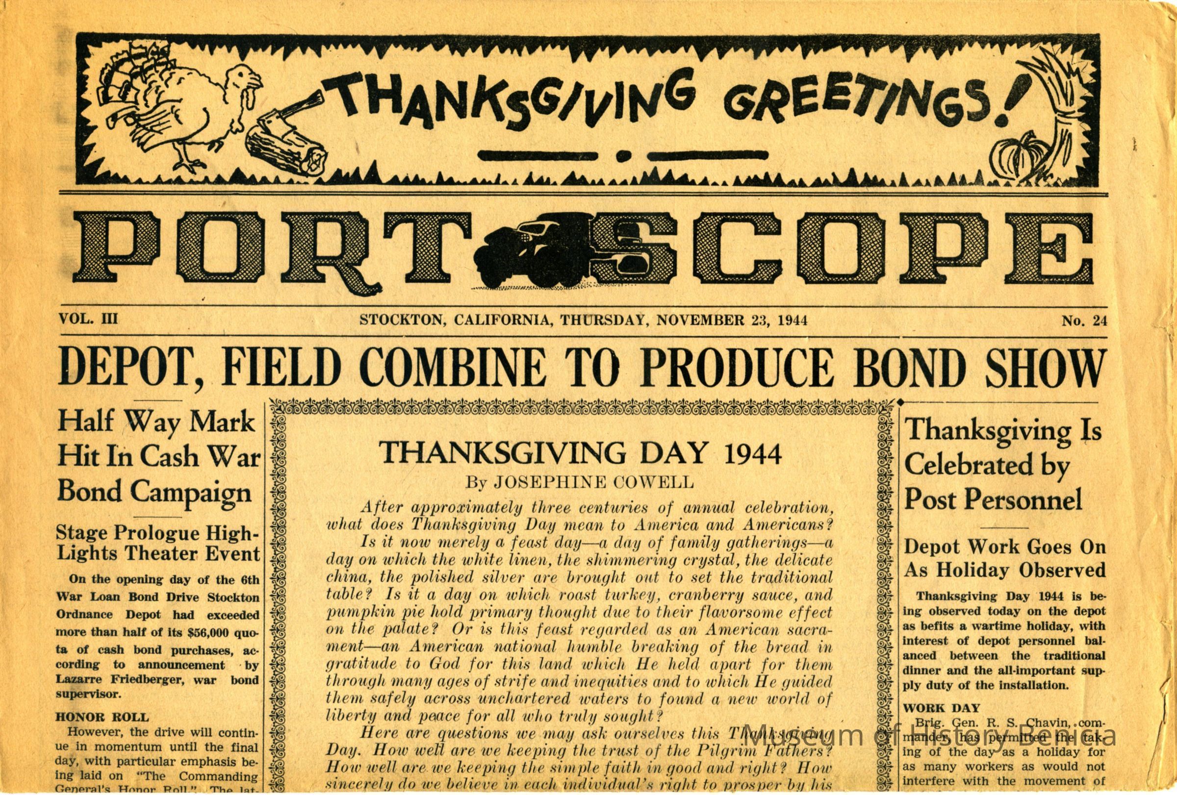This is a newspaper called "Port Scope" from Stockton, Ca dated 11/23/1944. The front page has articles about the Stockton Depot's War Bond Drive. It also contains an article by Josephine Cowell on Thanksgiving.Collection