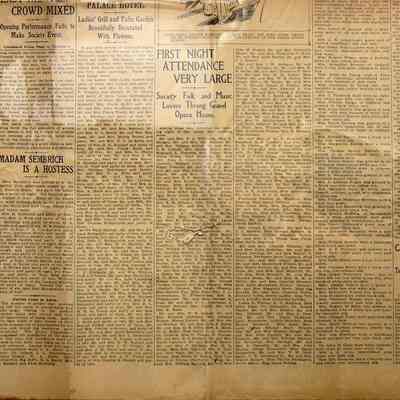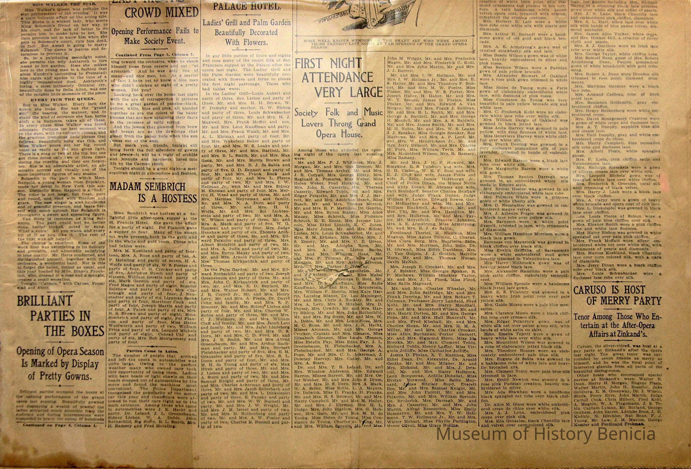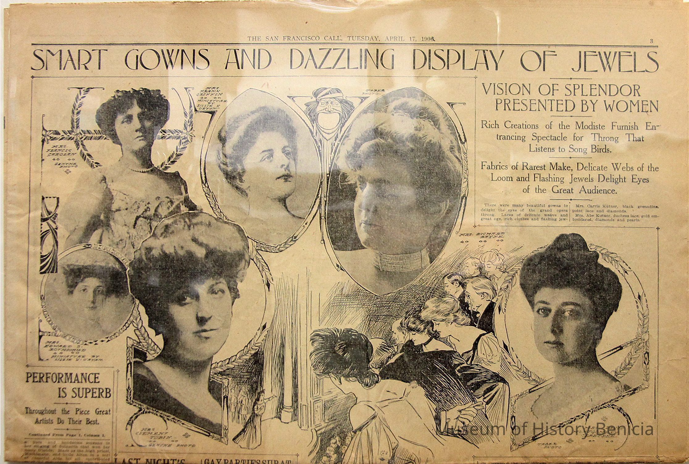 This is the S.F. Call newspaper of 04/17/1906. It is the fashion section of the newspaper. Besides photos of society women who were at the SF Opera. The star that night was Caruso. This is interesting because of the various stories about Caruso being caught in the SF earthquake.
