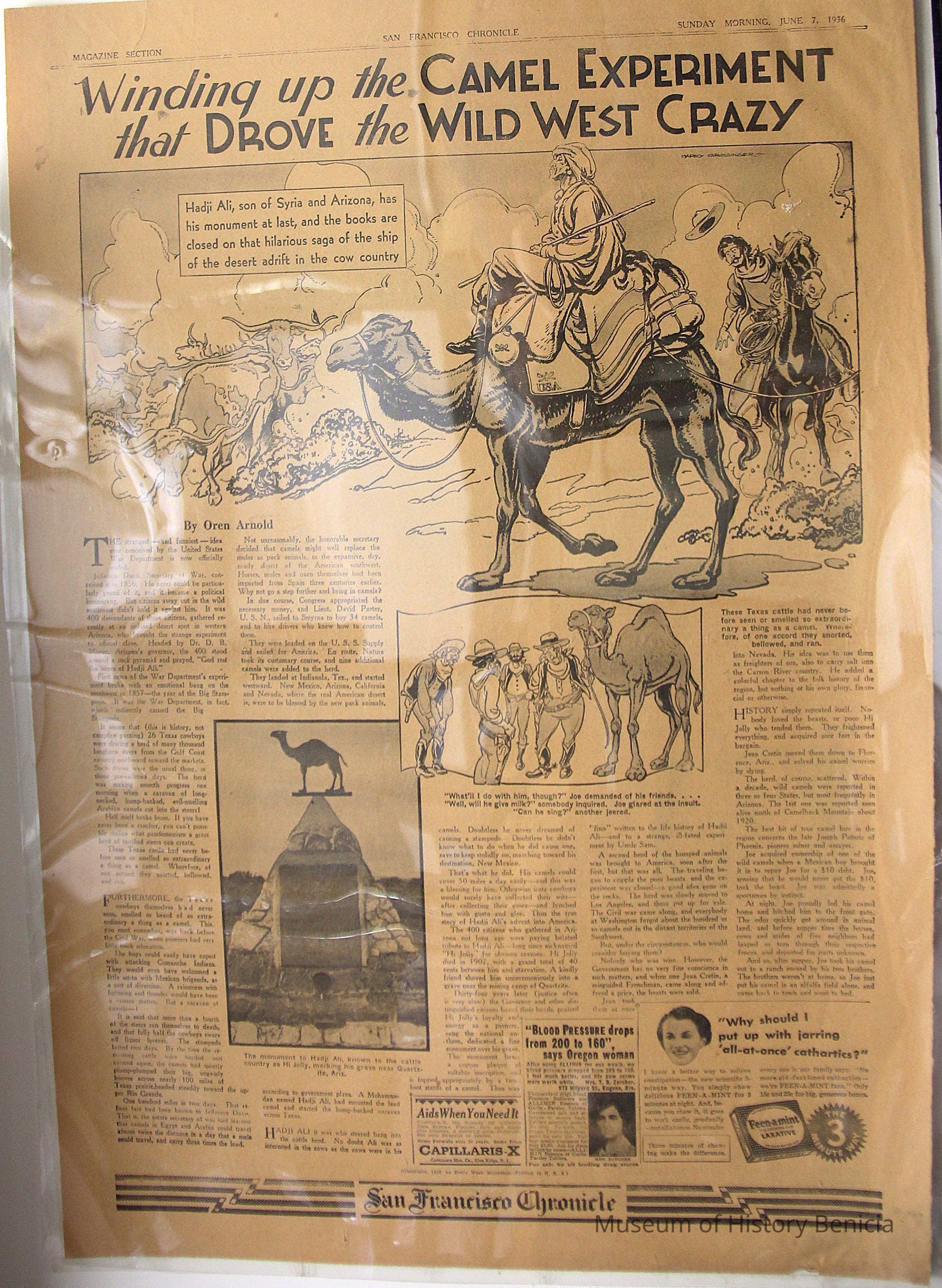 This is the San Francisco Chronicle from 06/07/1936. The headline talks of the Camel Experiment where the US Army imported camels to be used in the deserts of the West.Collection