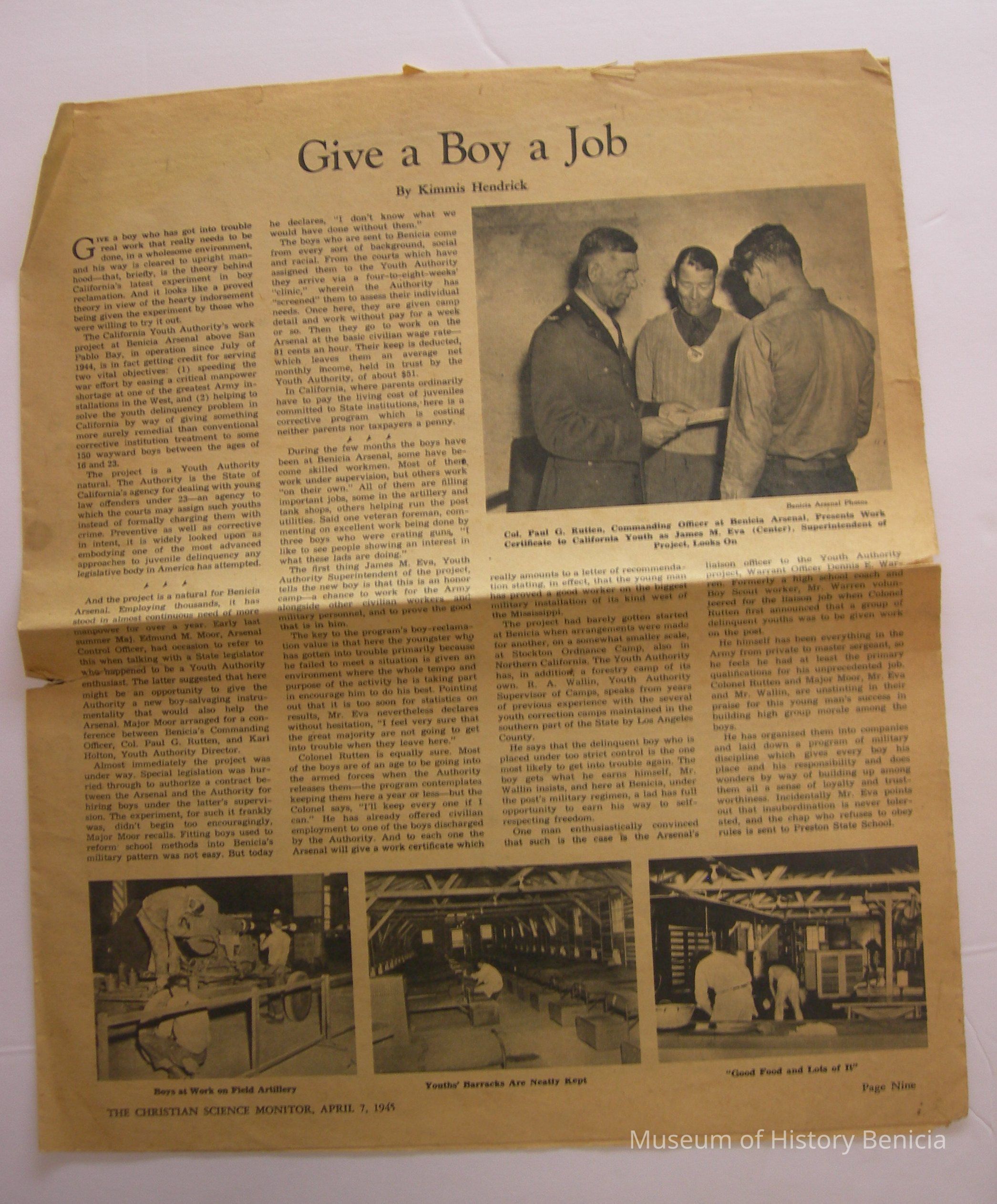 Article of Interest is about Benicia Arsenal's work project in conjunction with the California Youth Authority (page 9);
