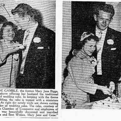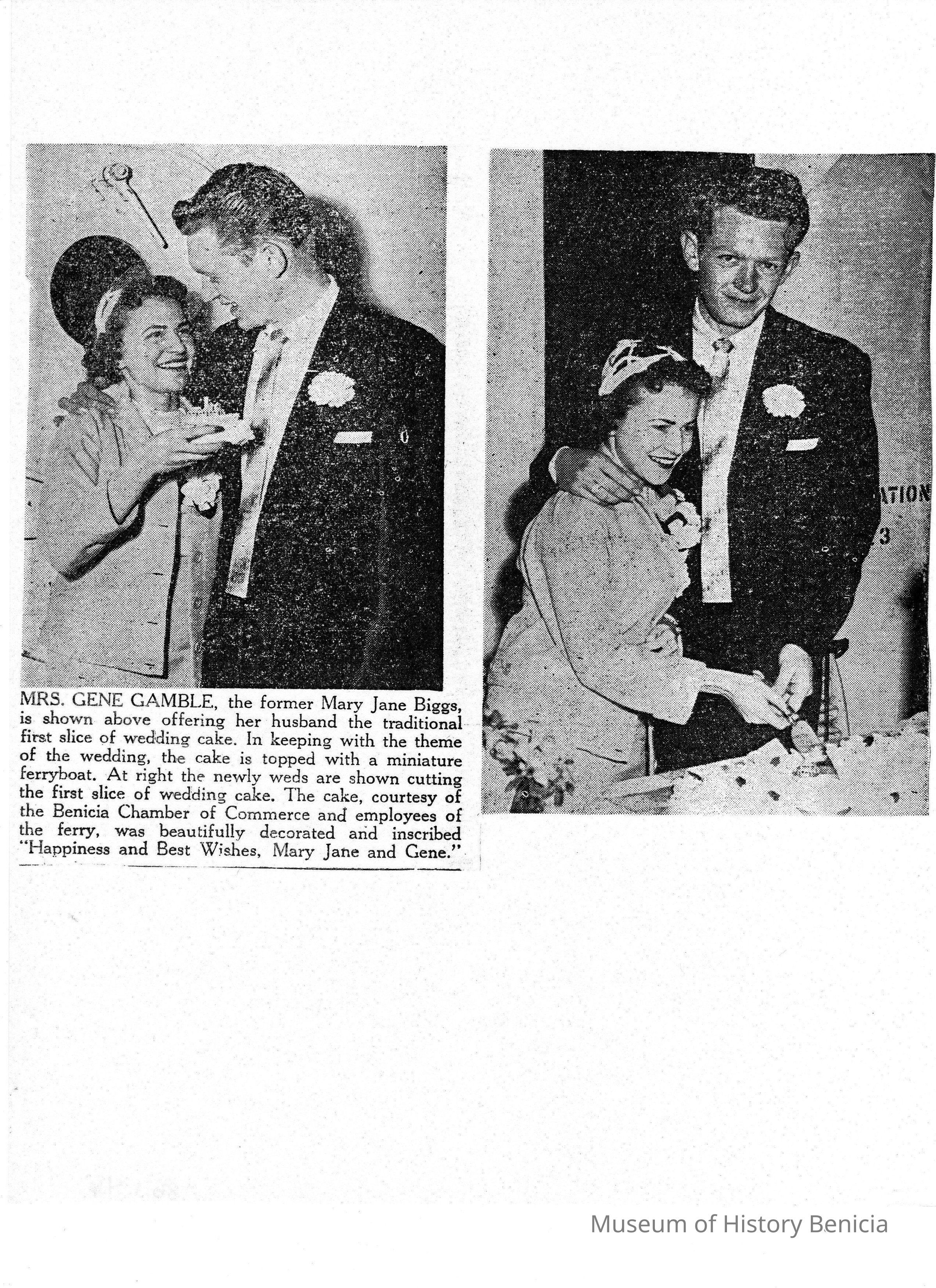 B/W photocopy of 2 photos of Mr. and Mrs. Gene Gamble with their wedding cake aboard the 'Carquinez.'