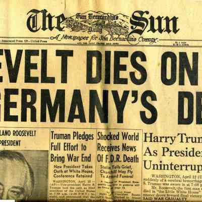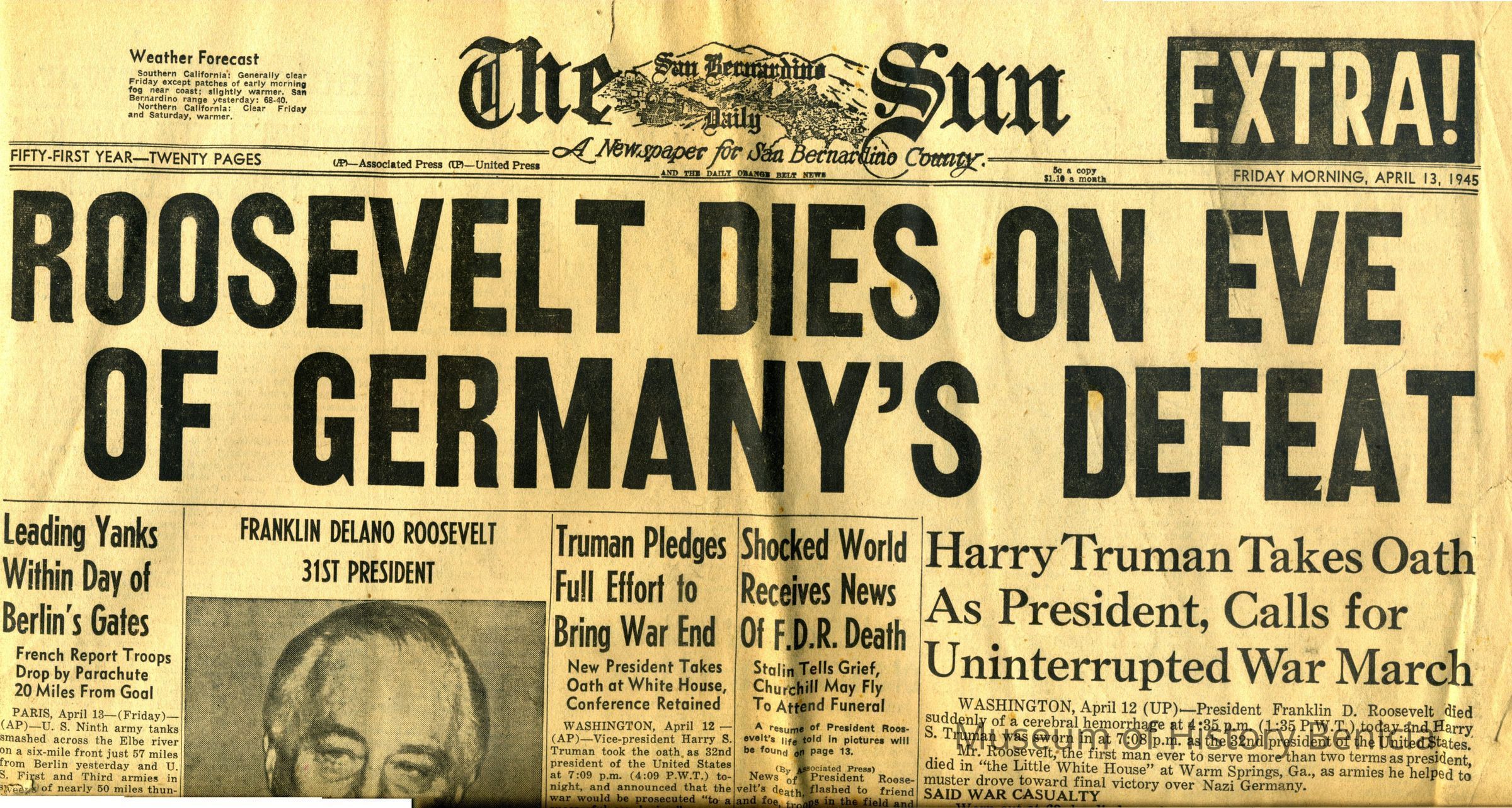 The San Bernardino Sun newspaper from 04/13/1945 with the headline "Roosevelt Dies on Eve of Germany's Defeat". Has a photo of Roosevelt.Collection