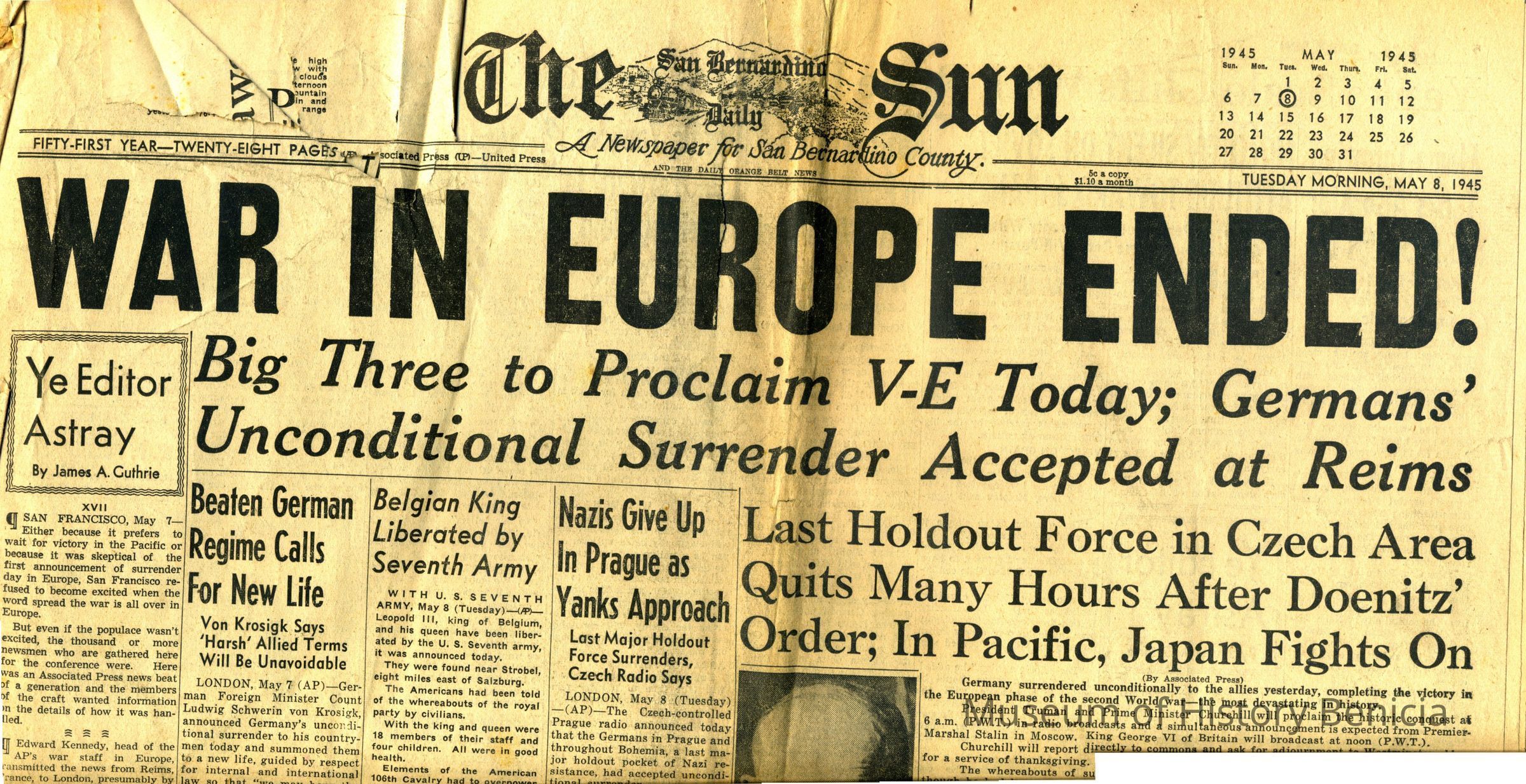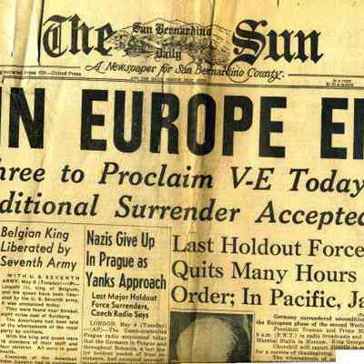The San Bernardino Sun newspaper from 05/08/1945 with the headline "War in Europe Ended". Has a photo of Eisenhower.