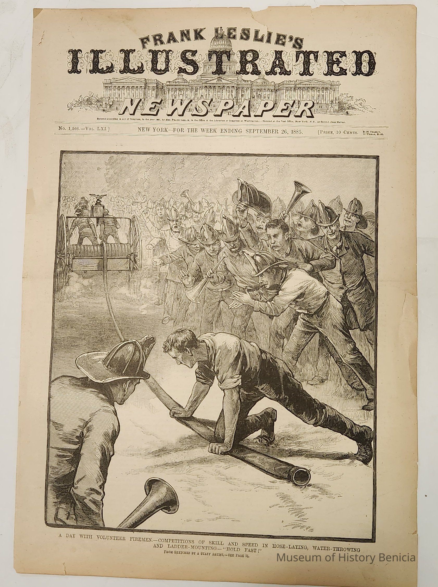 A single sheet - front page with a B/W lithograph of firefighters in competition, sketched by a staff artist.