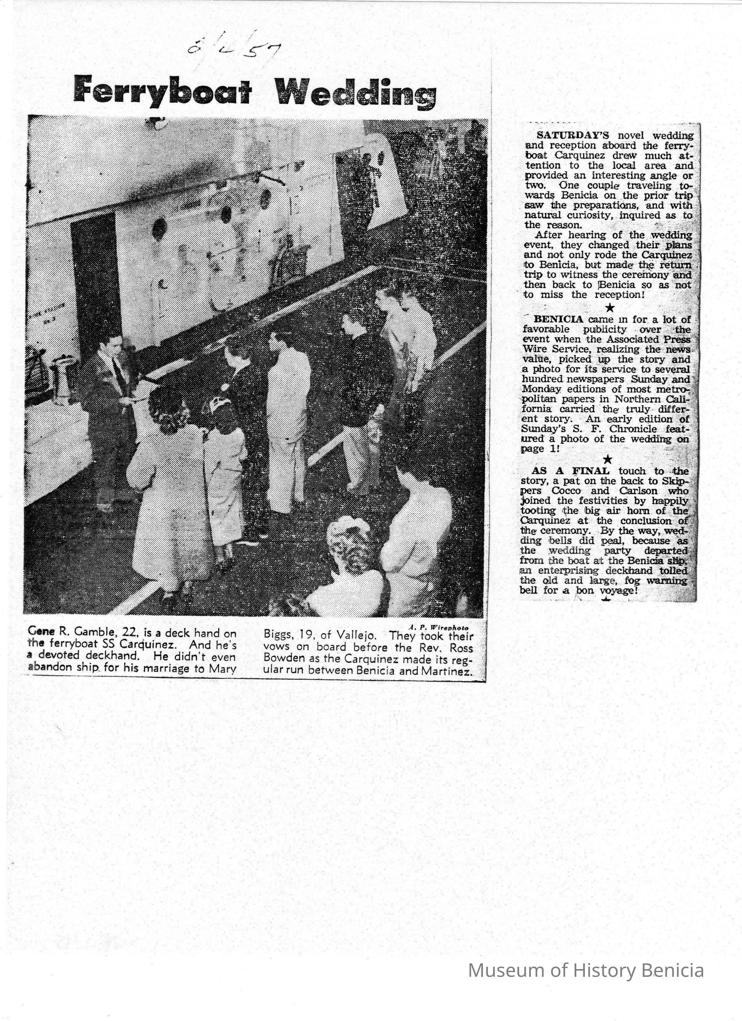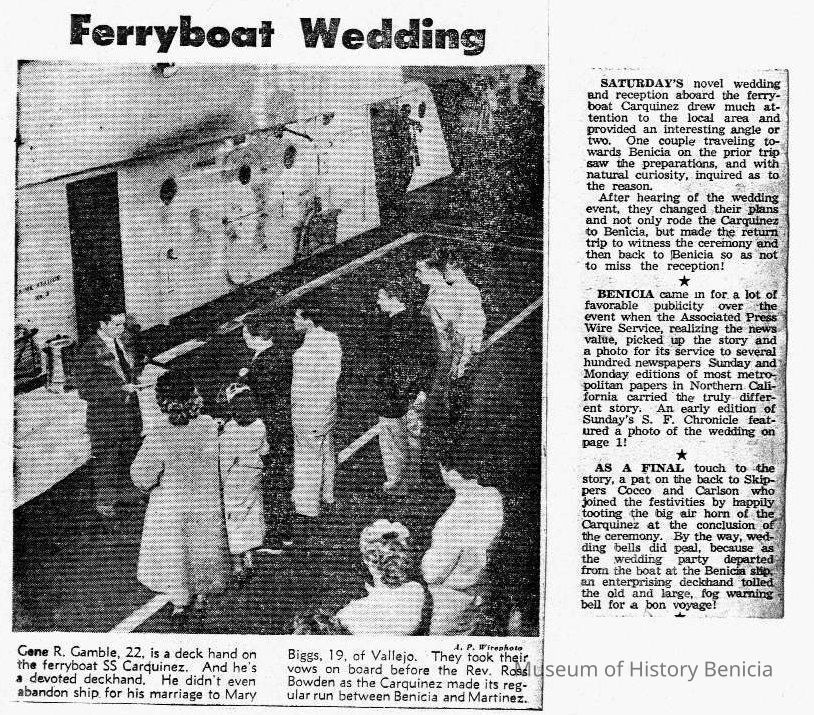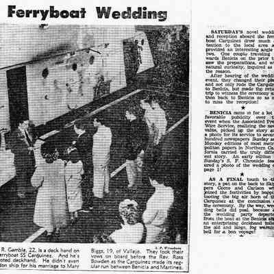B/W photocopy, "Ferryboat Wedding," dated 2/4/57, photo of the marriage of Gene Gamble to Mary Biggs aboard the 'Carquinez.'
