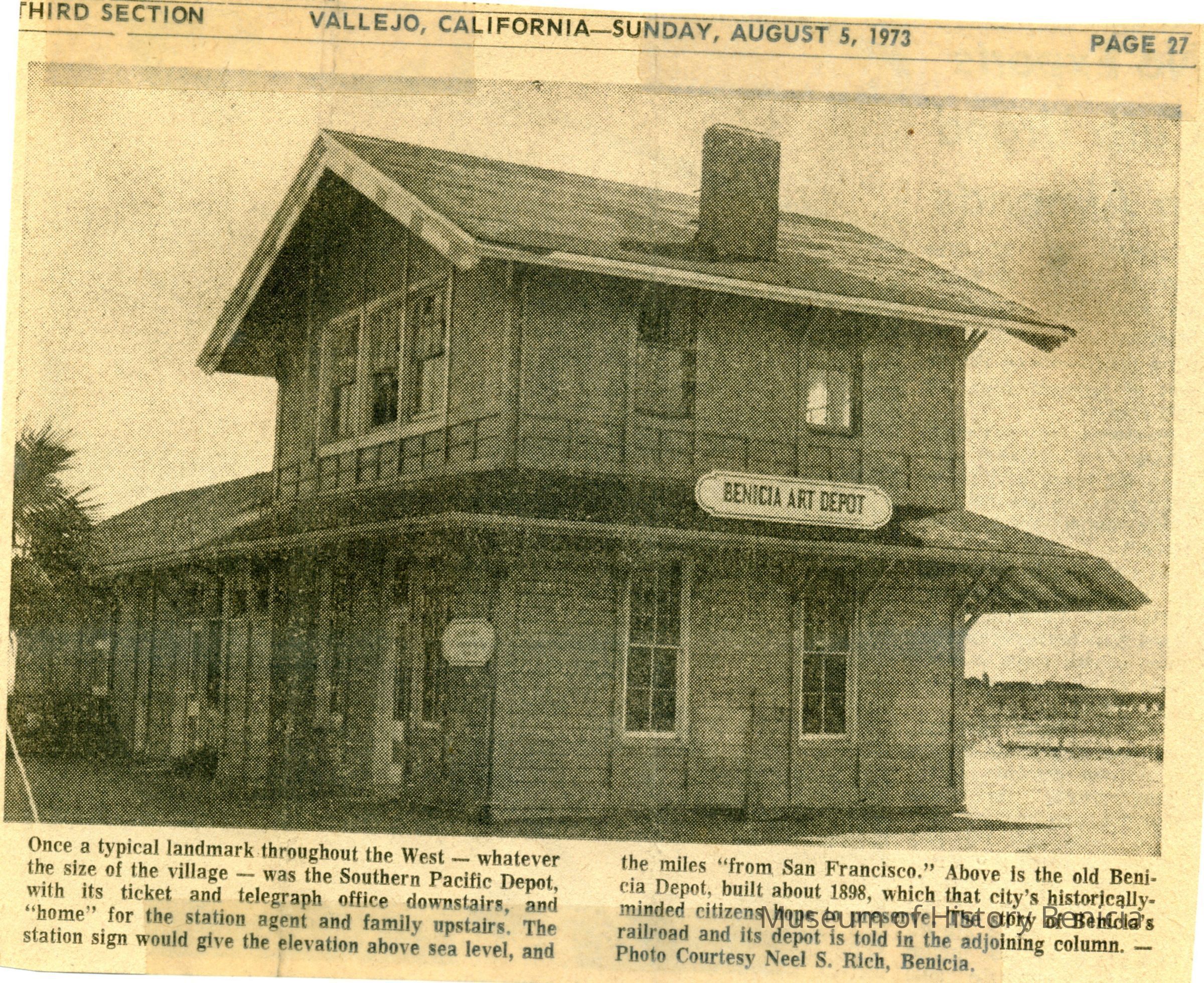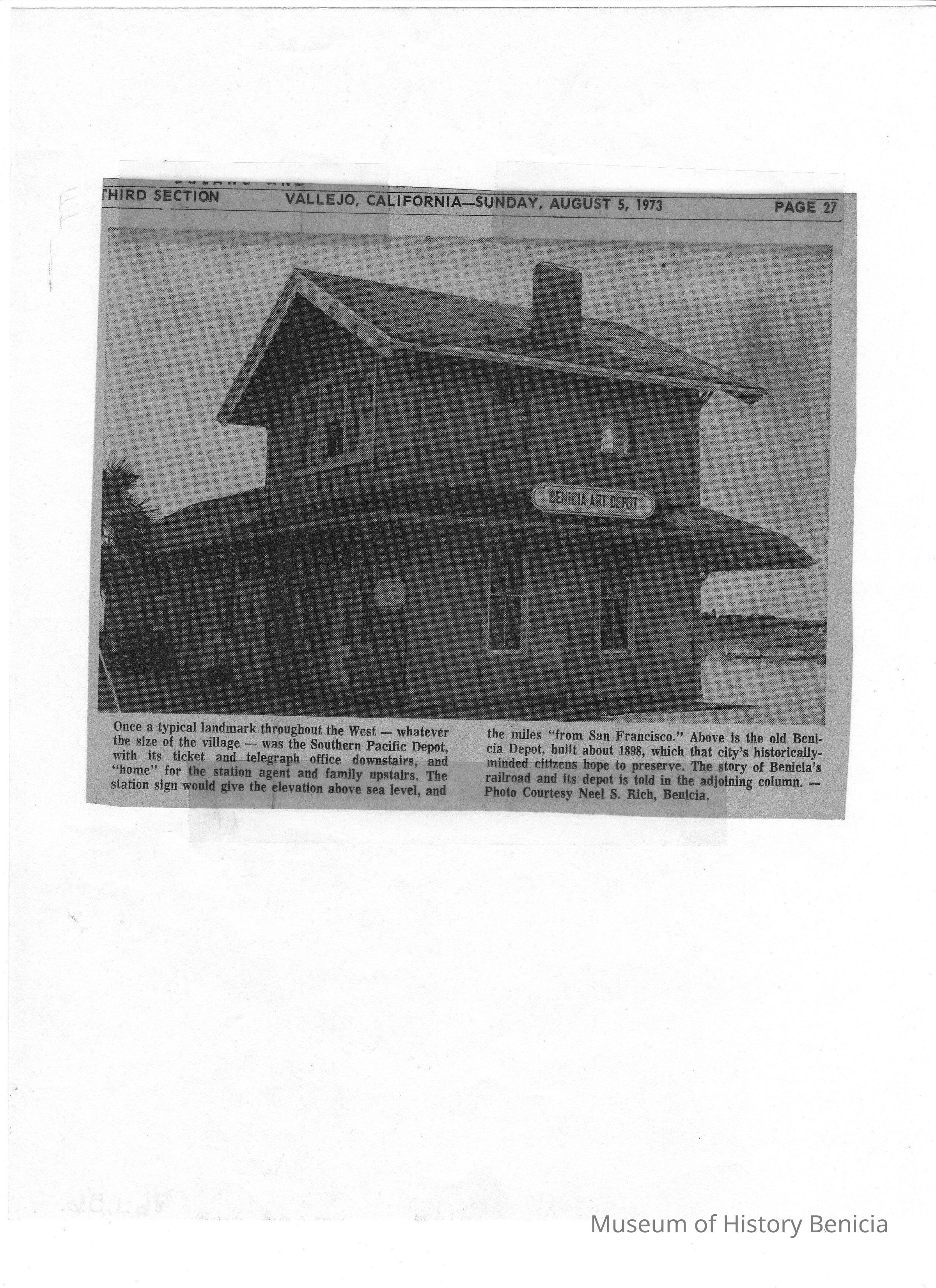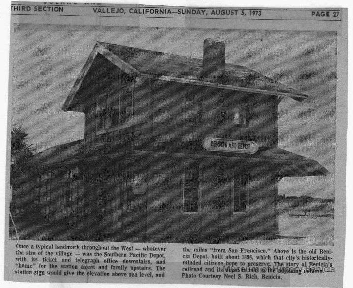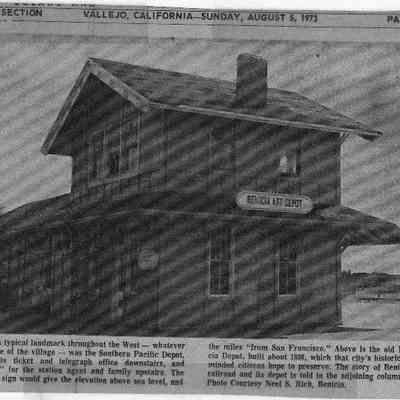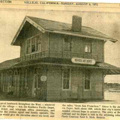 B/W newspaper photo run Aug. 5, 1973 of the Southern Pacific Depot. Sign at the time says Benicia Art Depot.