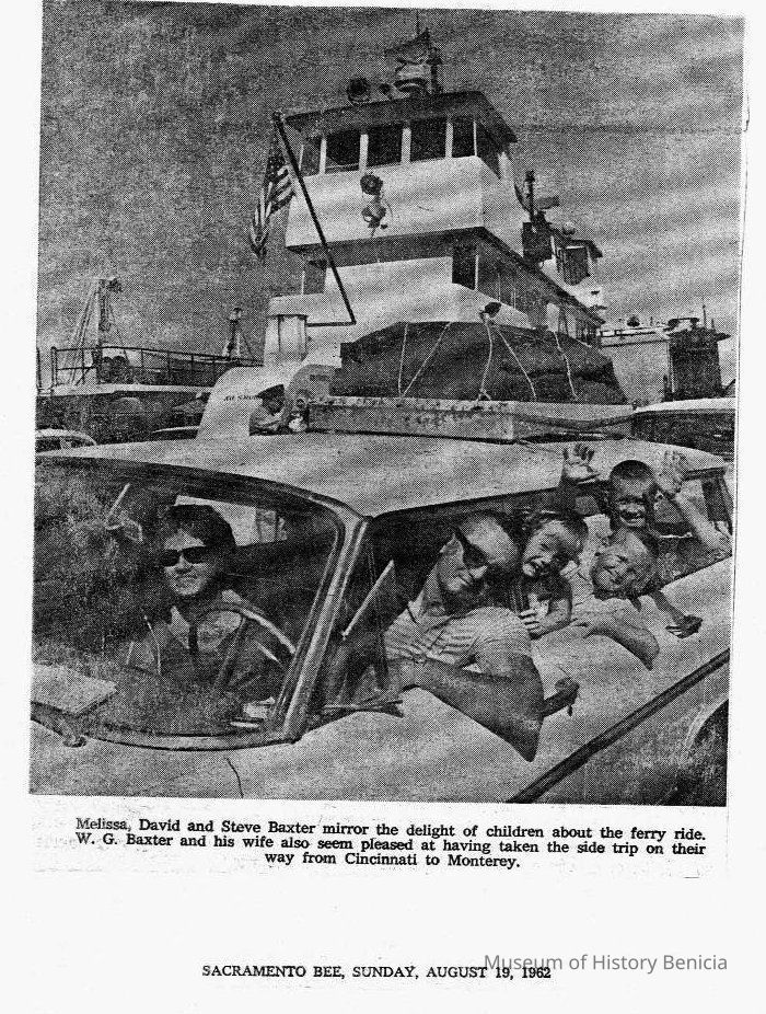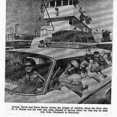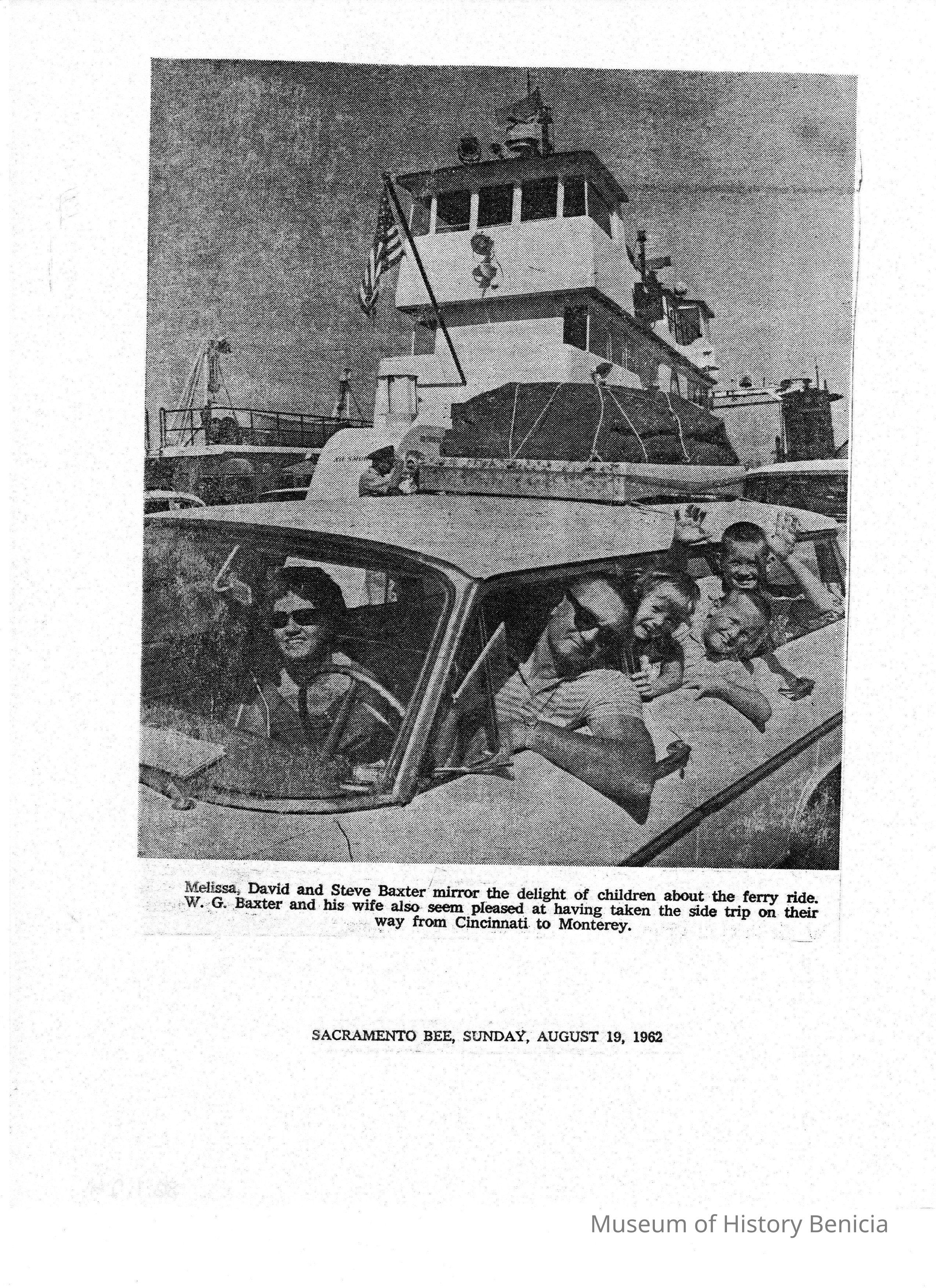 B/W photocopy, Sacramento Bee, August 19, 1962, of the Baxter family on a ferry ride in their car.