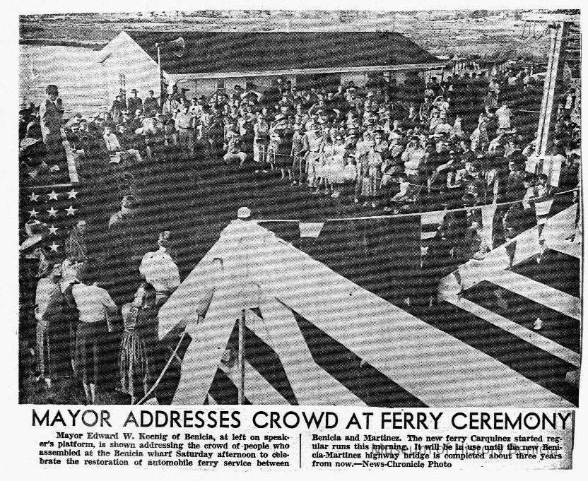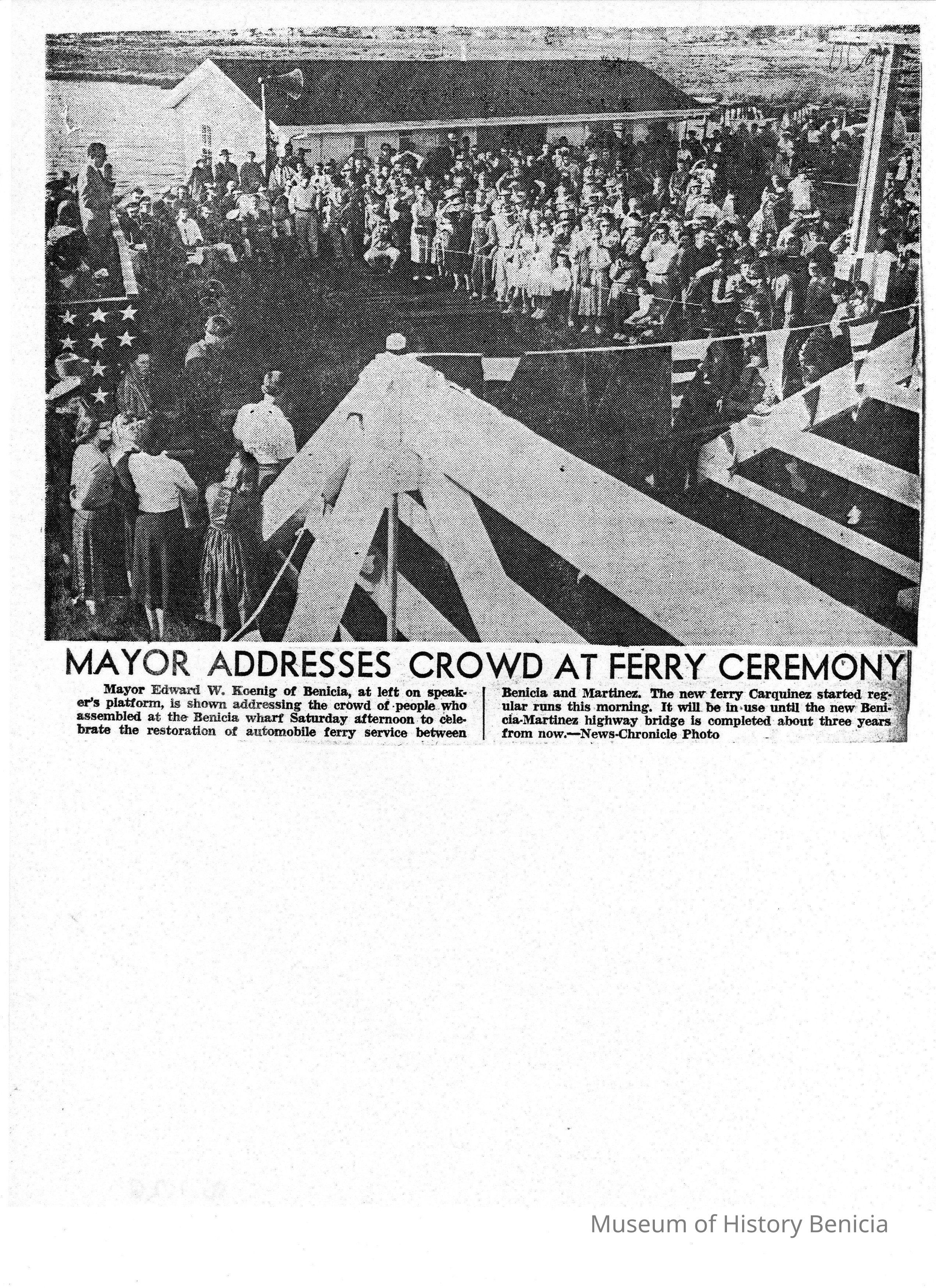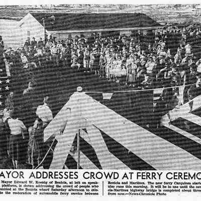 B/w photocopy of photo and article "Mayor Addresses Crowd at Ferry Ceremony," concerning the Mayor Edward W. Koenig's address at the celebration of the restored automobile ferry service.Collection