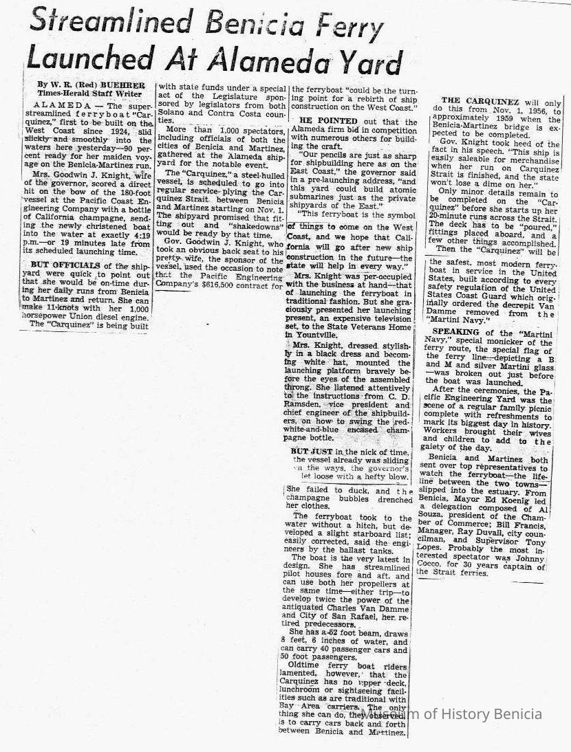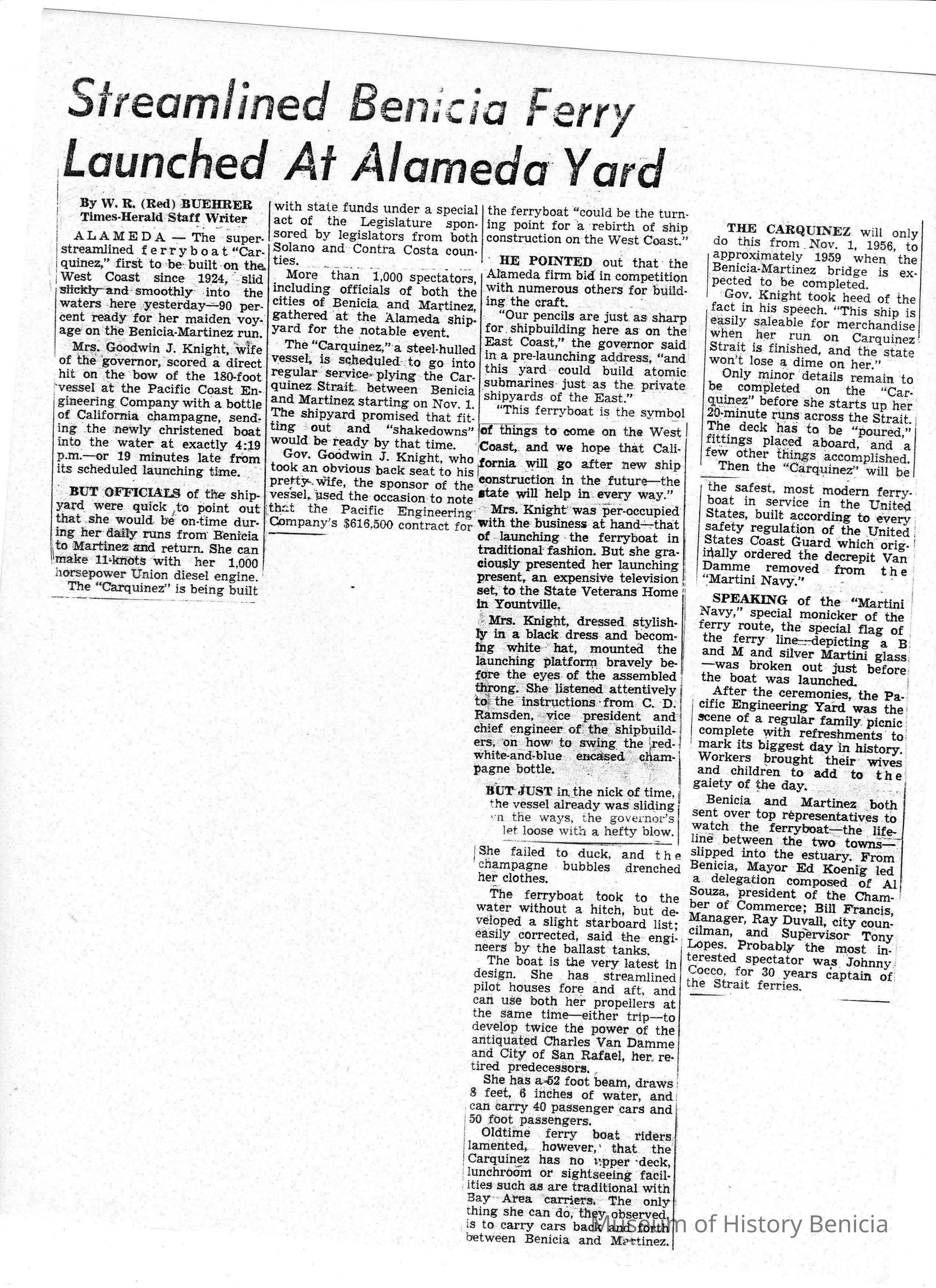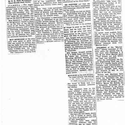 B/W photocopy of article entitled "Streamlined Benicia Ferry Launched Alameda Yard," about the launch of the ferry 'Carquinez,' From the Vallejo Times-Herald.Collection