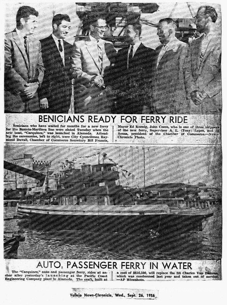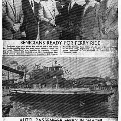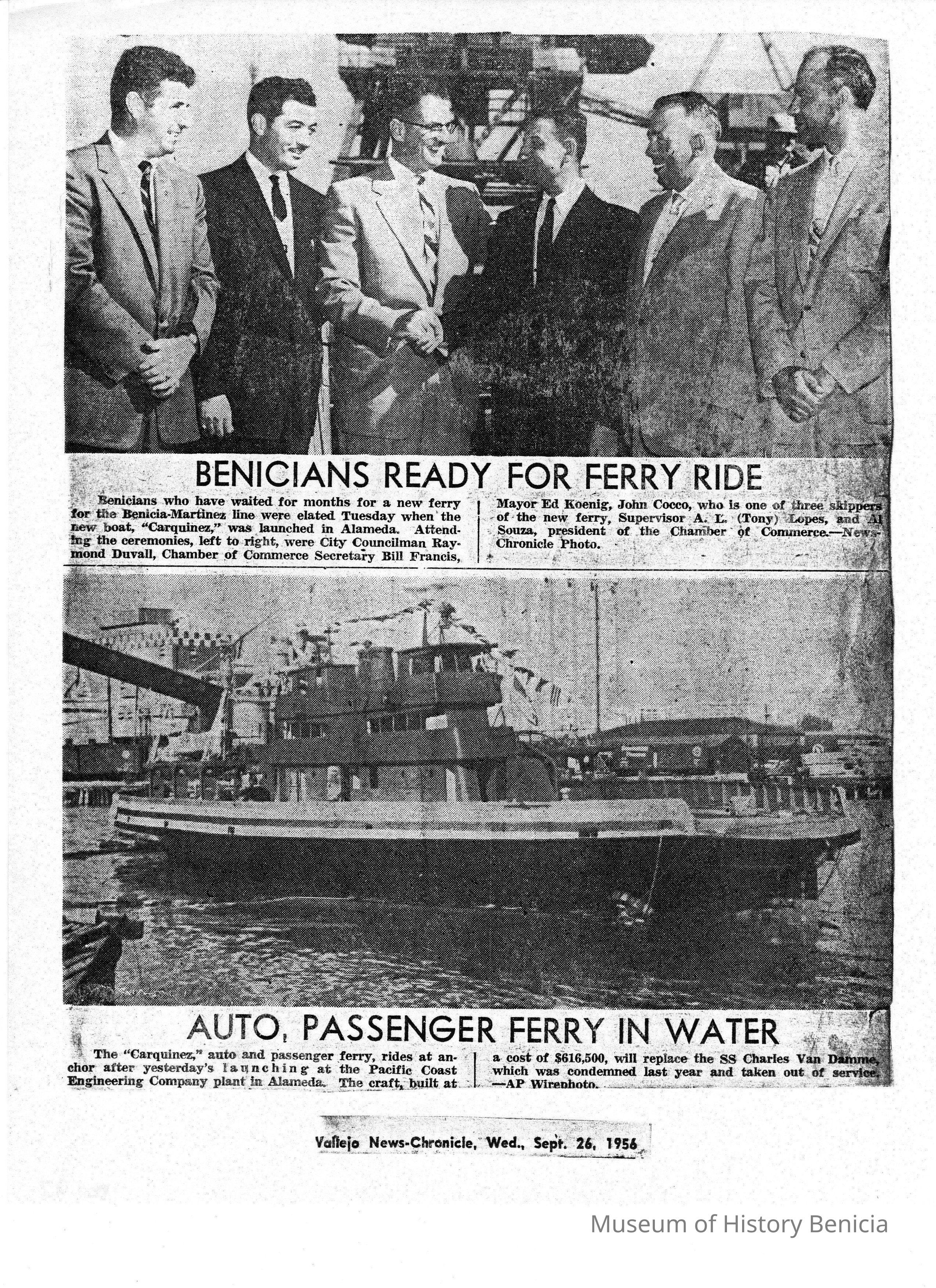 B/W photocopy of two photographs, Vallejo New-Chronicle, Wed., Sept. 26, 1956, "Benicians ready for Ferry Ride," "Auto, Passenger ferry in water," about the launch of the 'Carquinez.'Collection