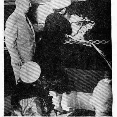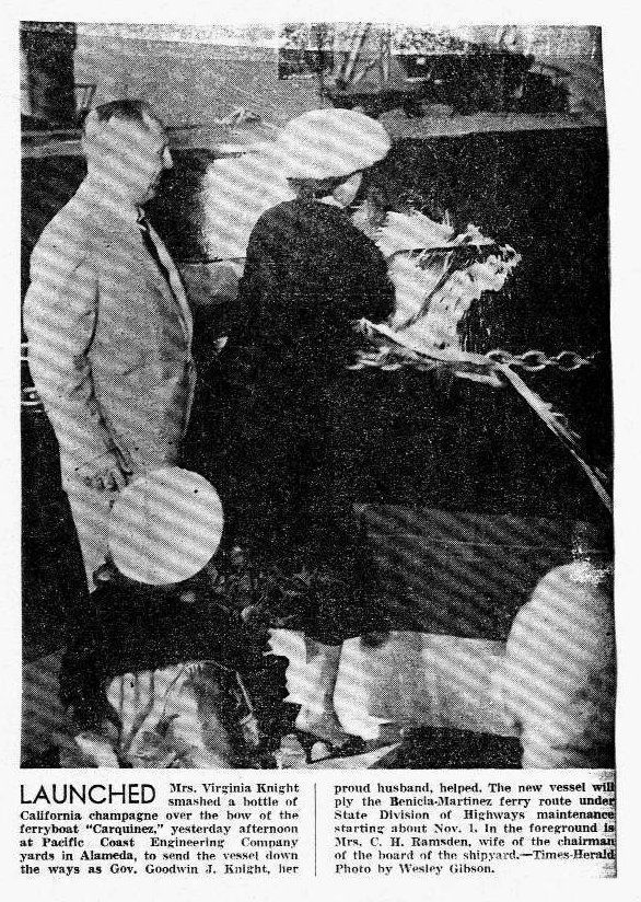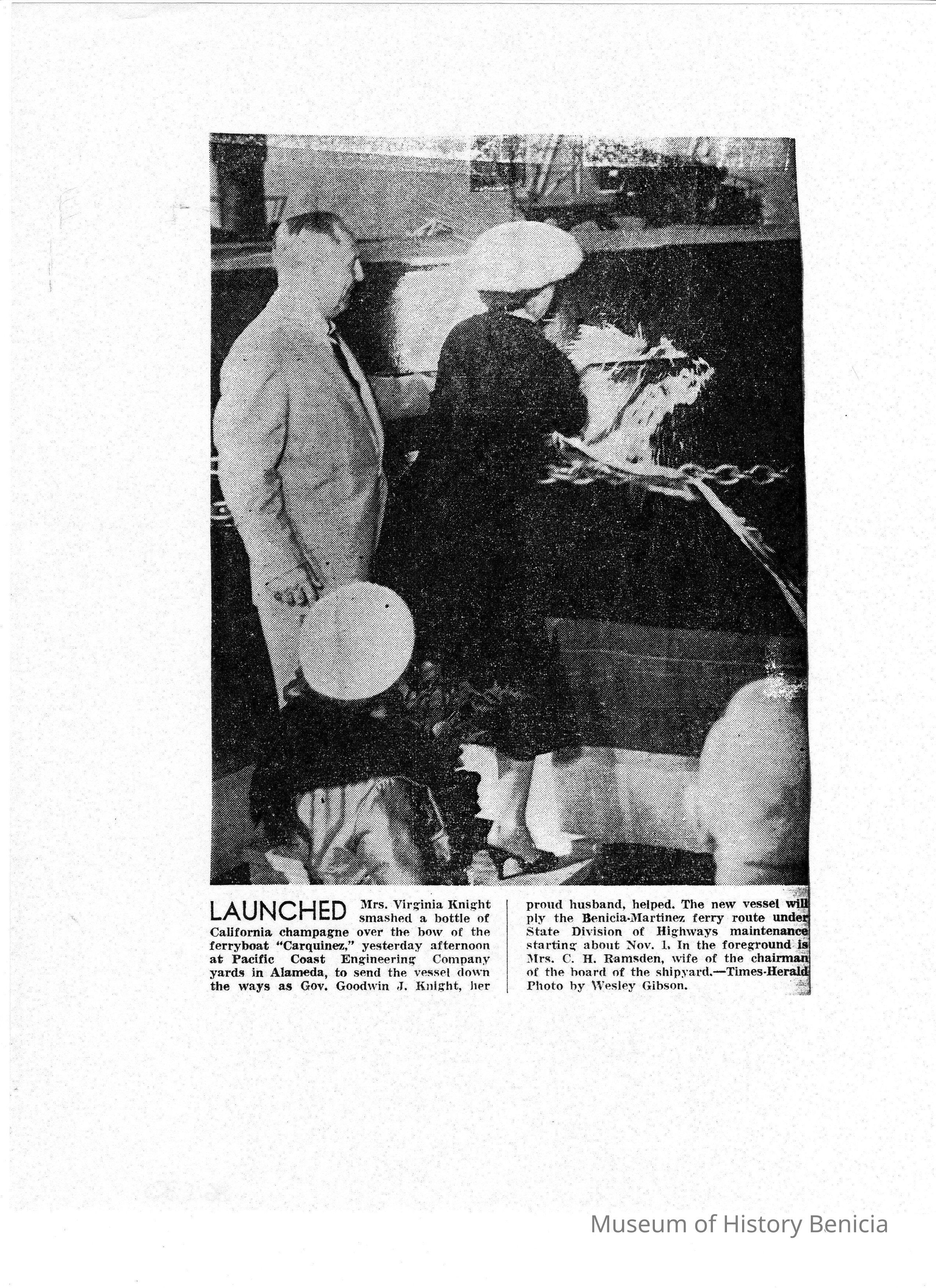 B/W photocopy of photo headed "Launched," where Mrs. Virginia Knight smashes a bottle of CA champagne over the bow of the Carquinez.