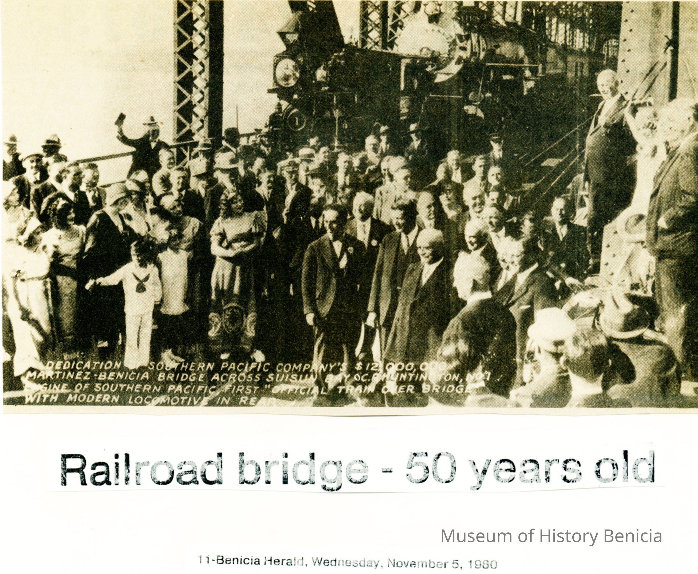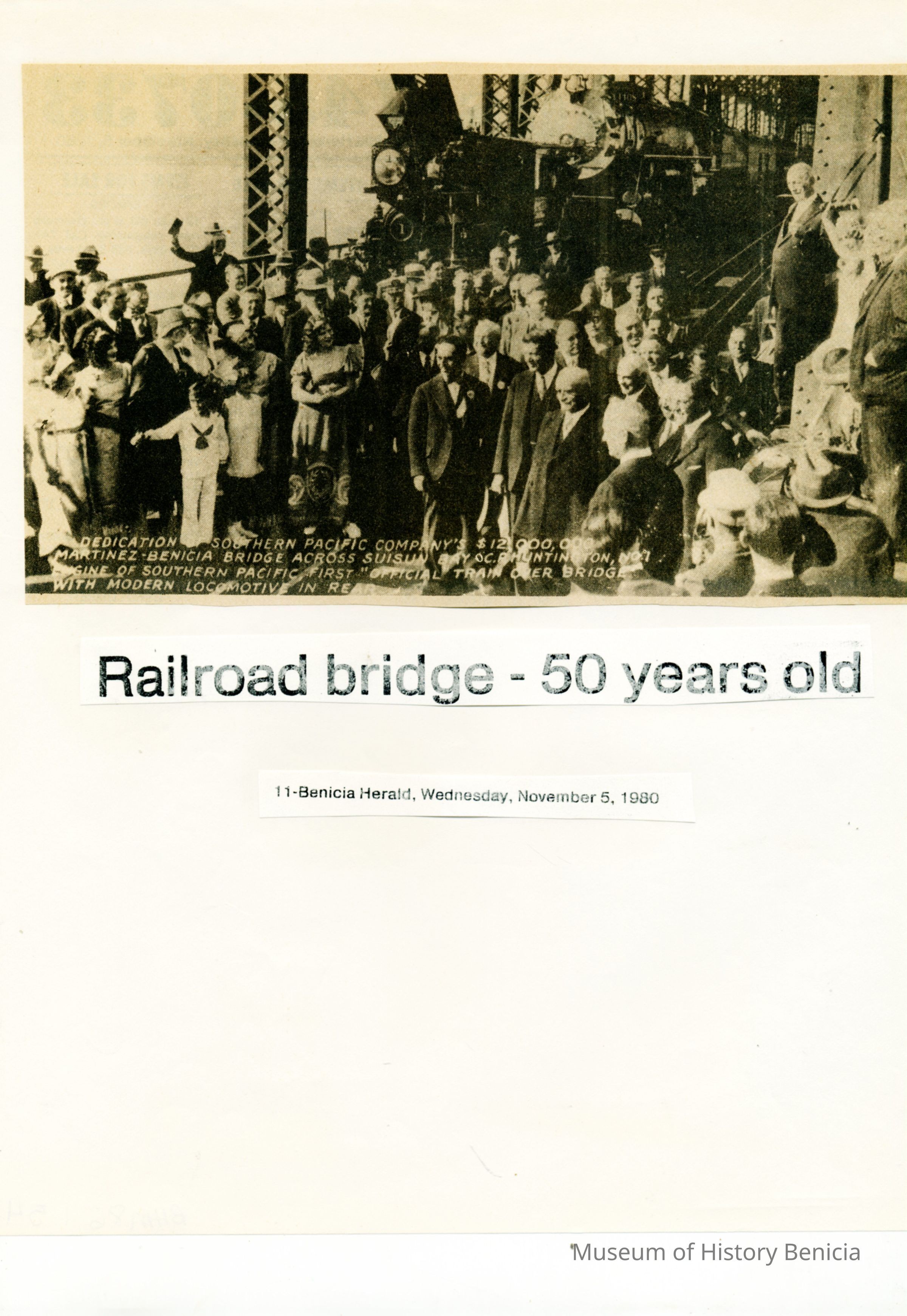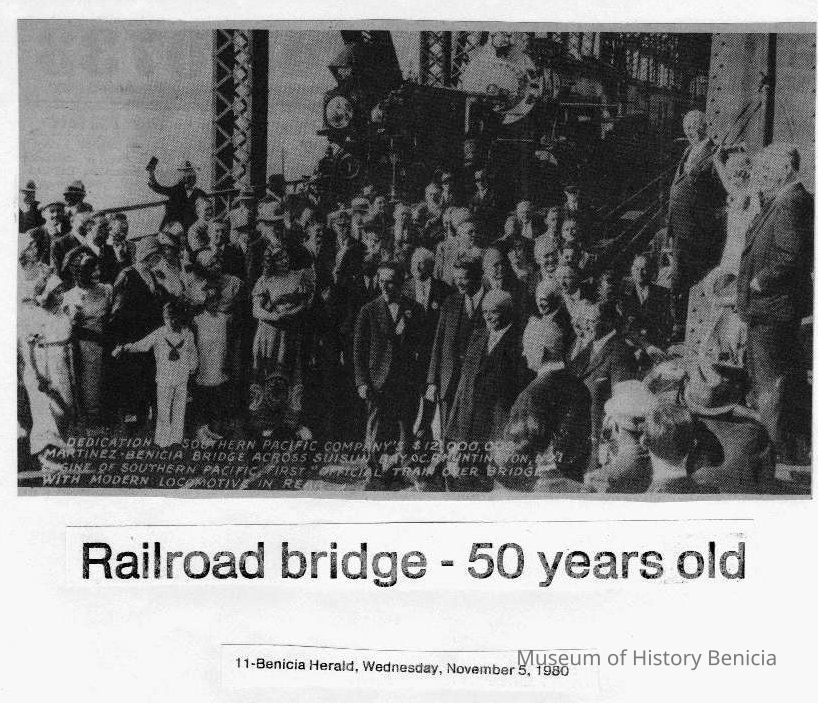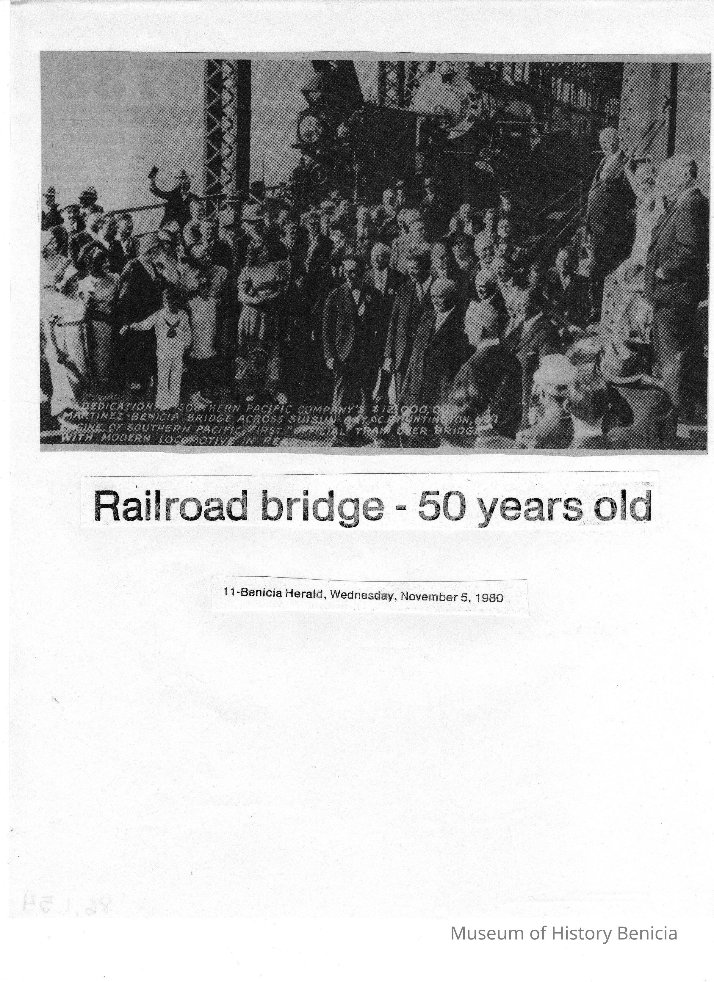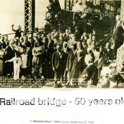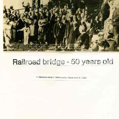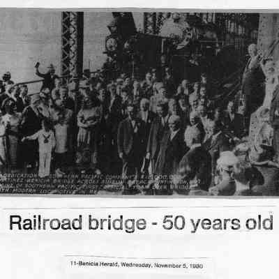 B/W photo of the dedication of one Benicia-Martinez bridge run Nov. 5, 1980 in the Benicia Herald with the heading "Railroad bridge-50 years old."Collection