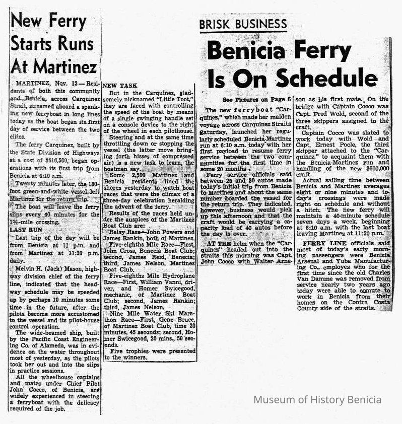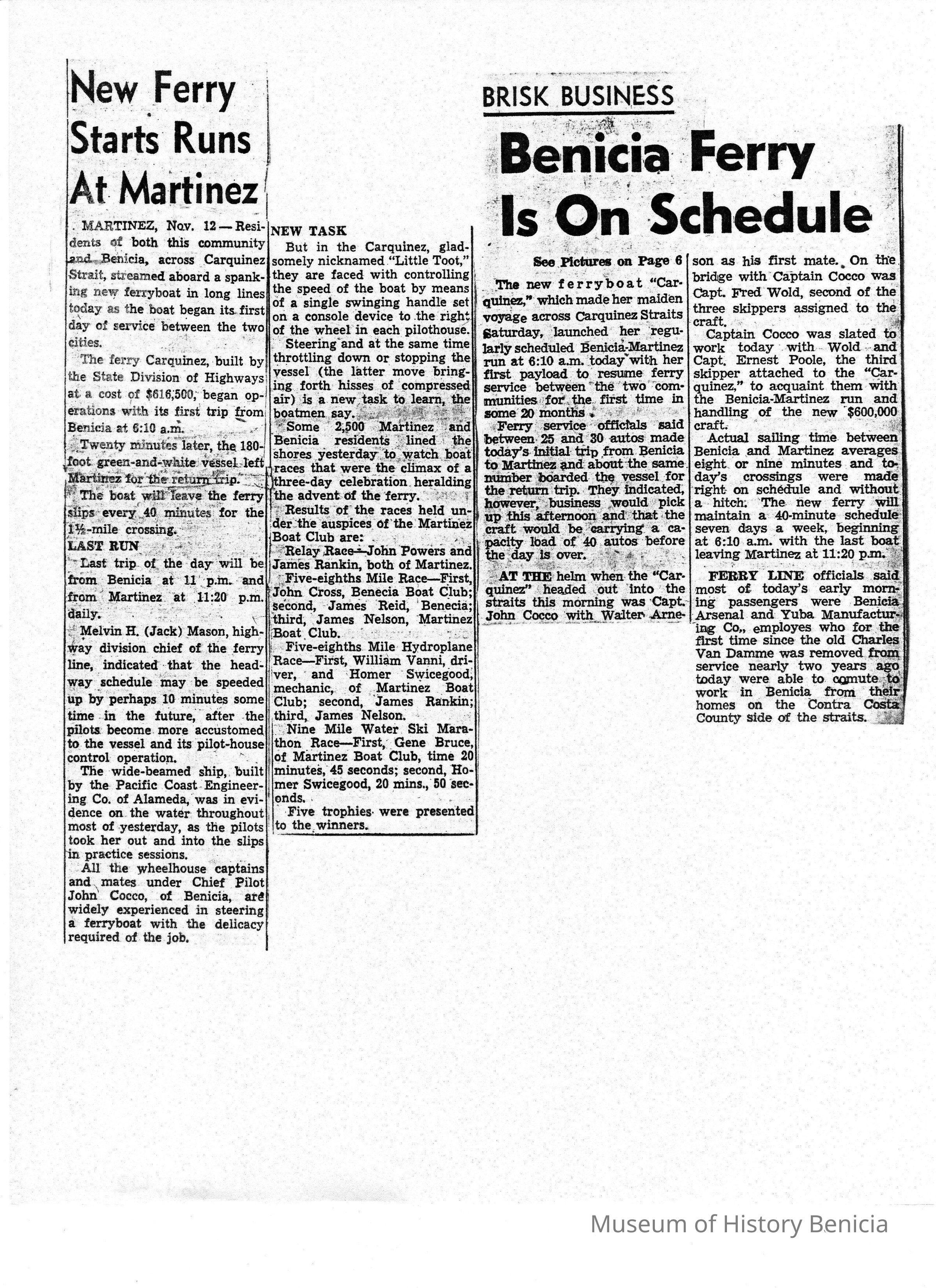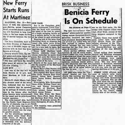 B/W photocopy, of two newspaper articles: "New Ferry Starts Runs At Martinez," and "Brisk Business: Benicia Ferry is on Schedule," both about the ferry's schedule.Collection