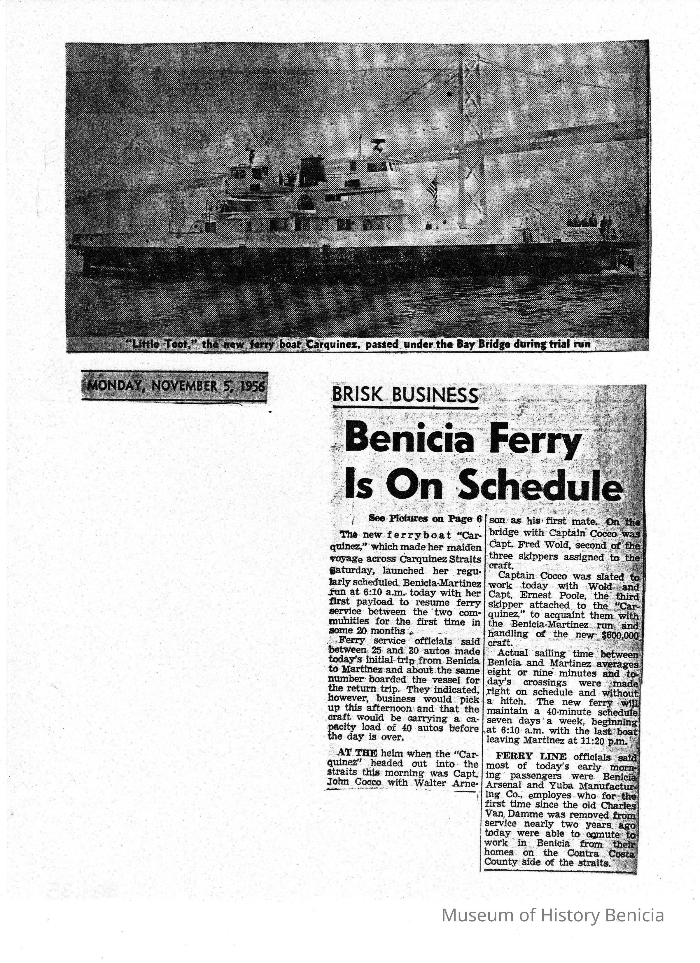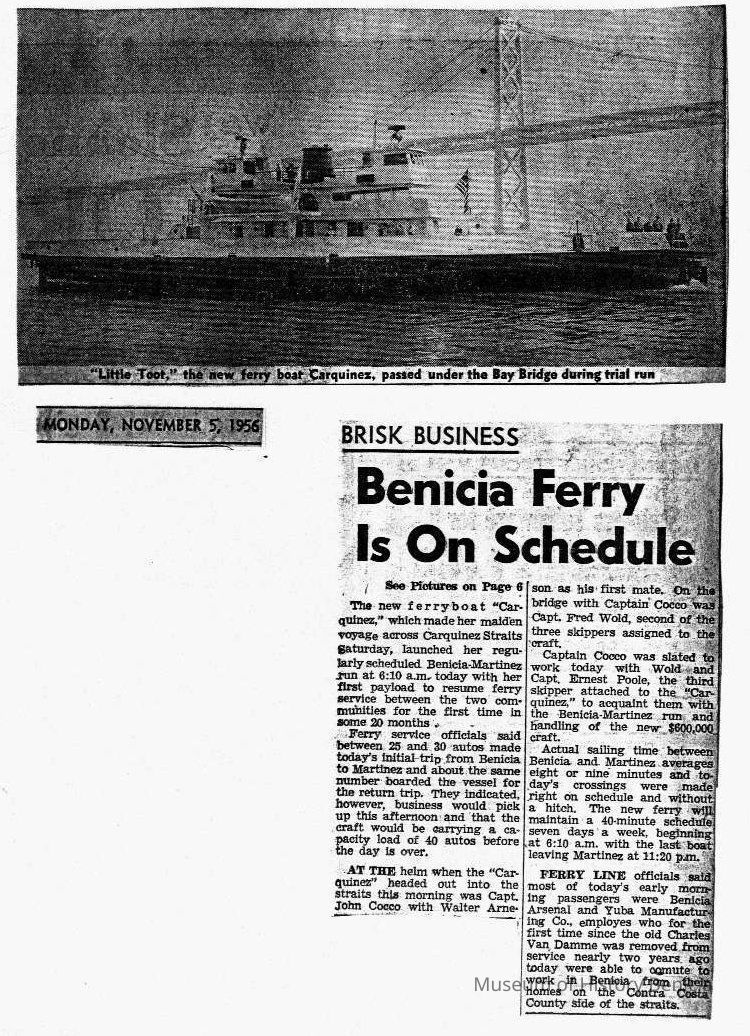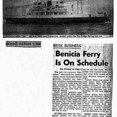 B/W photocopy, Monday, November 5, 1956, of photo and article entitled "Brisk Business-- Benicia Ferry Is On Schedule," about the launch and schedule of the 'Carquinez.'Collection