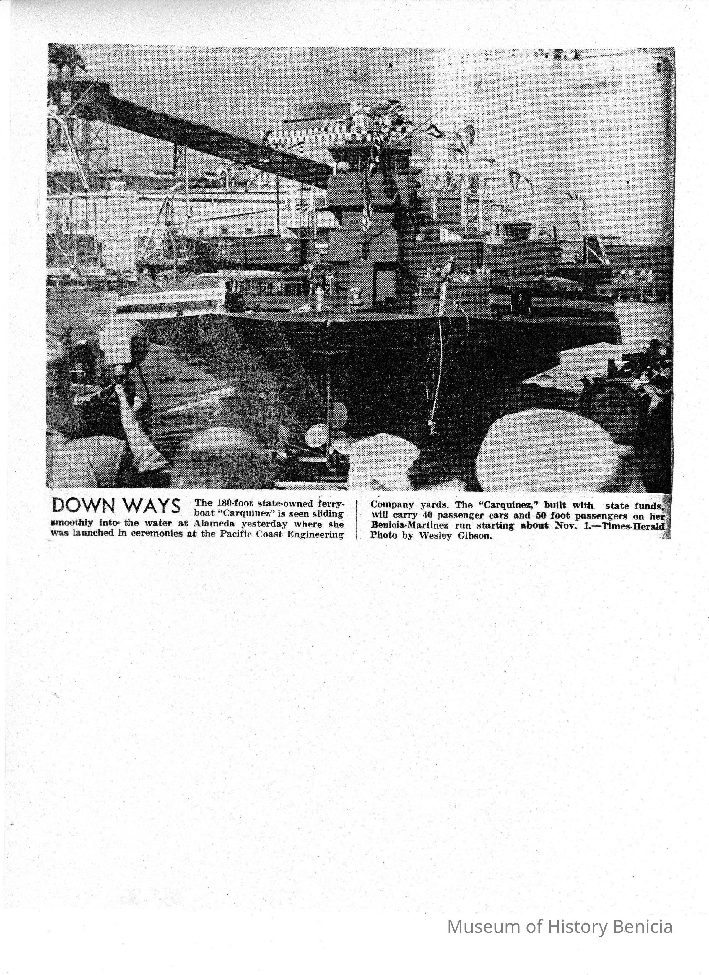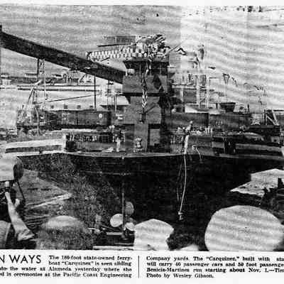 B/W photocopy, of newspaper photo of the launch of the 'Carquinez.' From the Vallejo-Times Herald, "Down Ways"