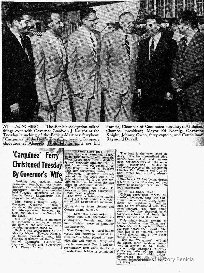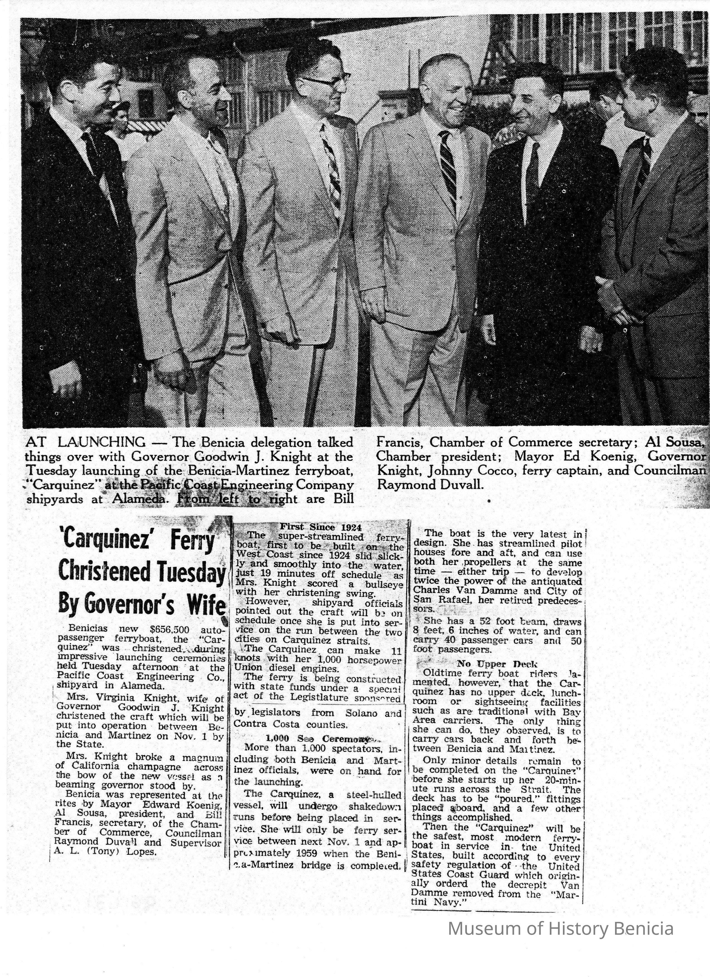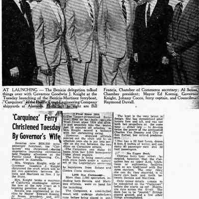 B/W photocopy of photo and newspaper article entitled "'Carquinez' Ferry Christened Tuesday By Governer's Wife," concerning christening ceremonies for the 'Carquinez.'Collection