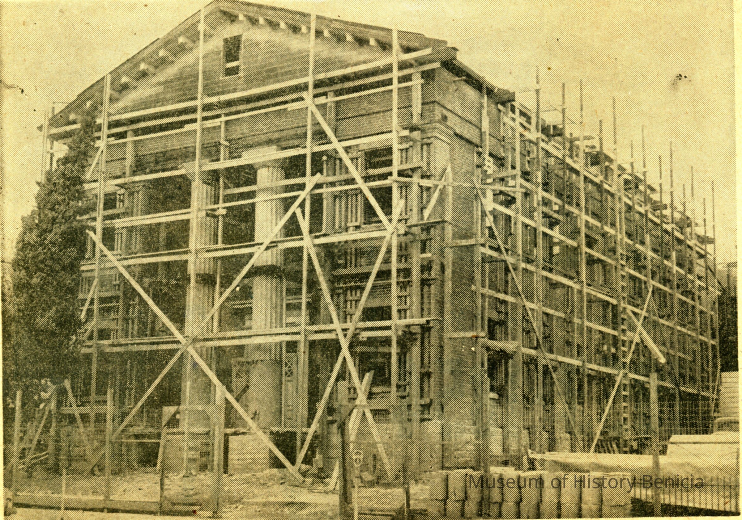 Photo of the Benicia State Capitol during restoration. It shows the scaffolding around the building. Taken from a newspaper.