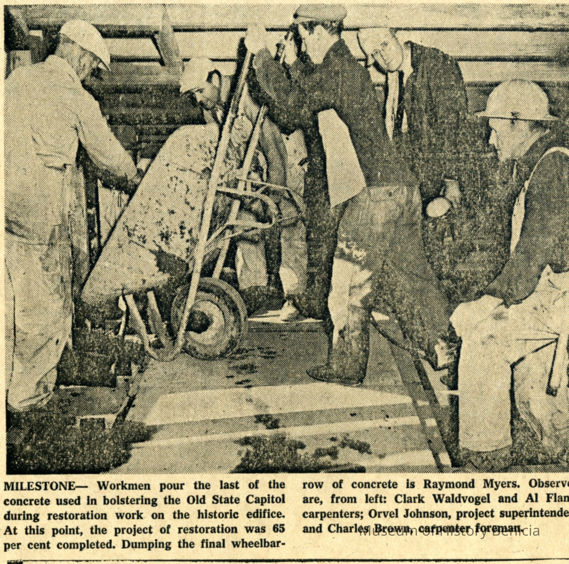 Photo of the Benicia State Capitol during restoration. It shows the last pour of concrete used during the restoration. It is from the Benicia Herald.Collection