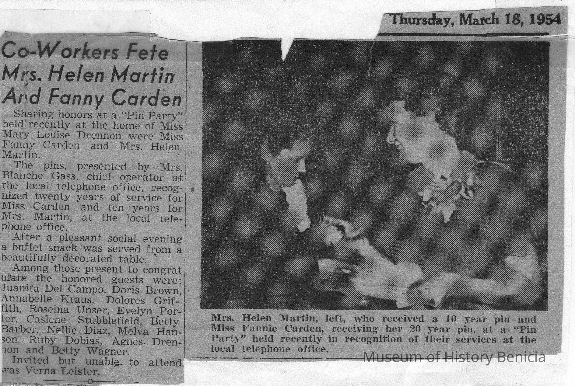 newspaper article originally taped to white paper with two photographs (1990.004.0013 and 1990.004.0014); From Thursday, March 18, 1954 Benicia Herald with headline: "Co-Workers Fete Mrs. Helen Martin and Fanny Carden"Collection