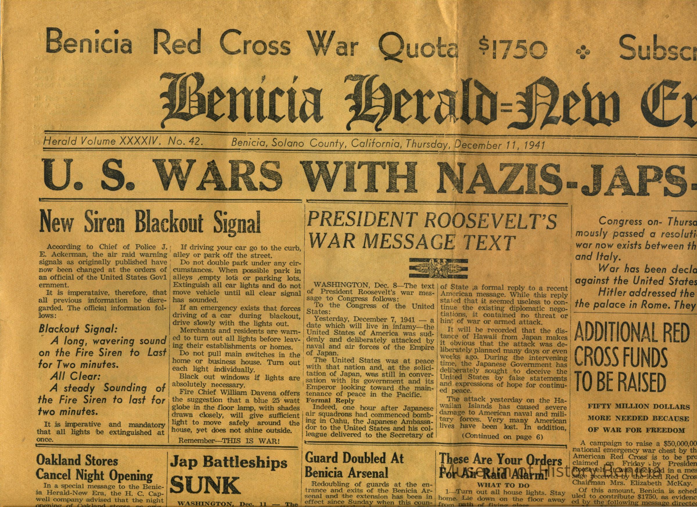 Benicia Herald-- New Era Newspaper. Vol. XXXXIV. No. 42, Dec. 11, 1941. Headline-- "U.S. wars with Nazis -- Japs -- Italy."