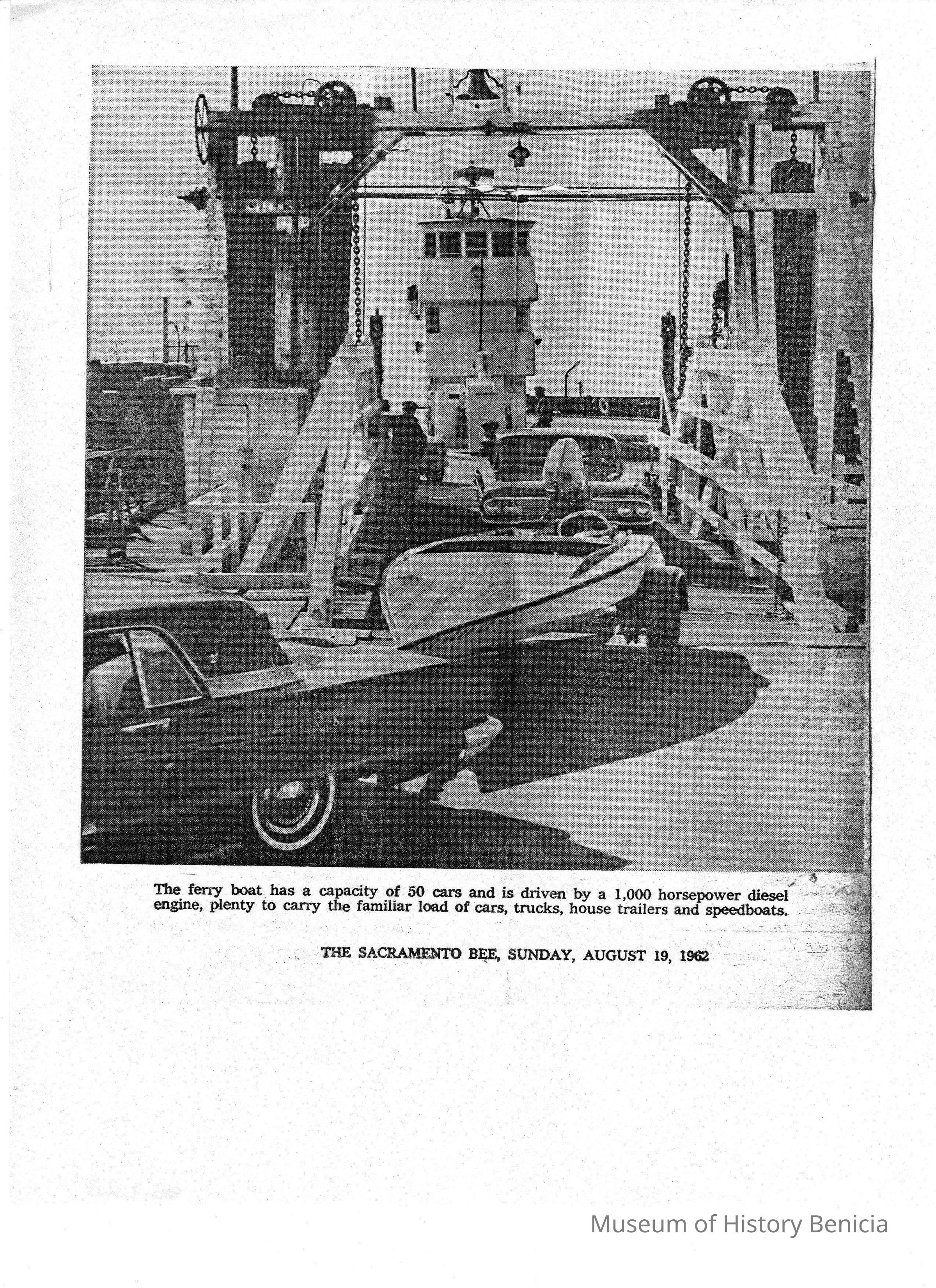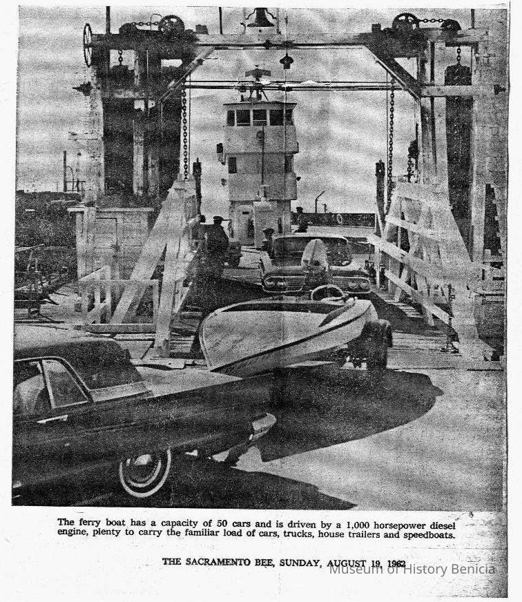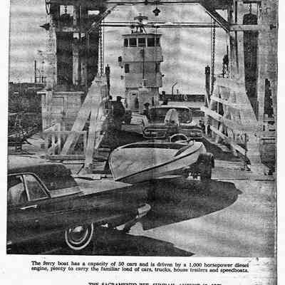 B/W photocopy of a photo run Aug. 19, 1962 in the Sacramento Bee of a ferry, with an accompanying line about its capacity.