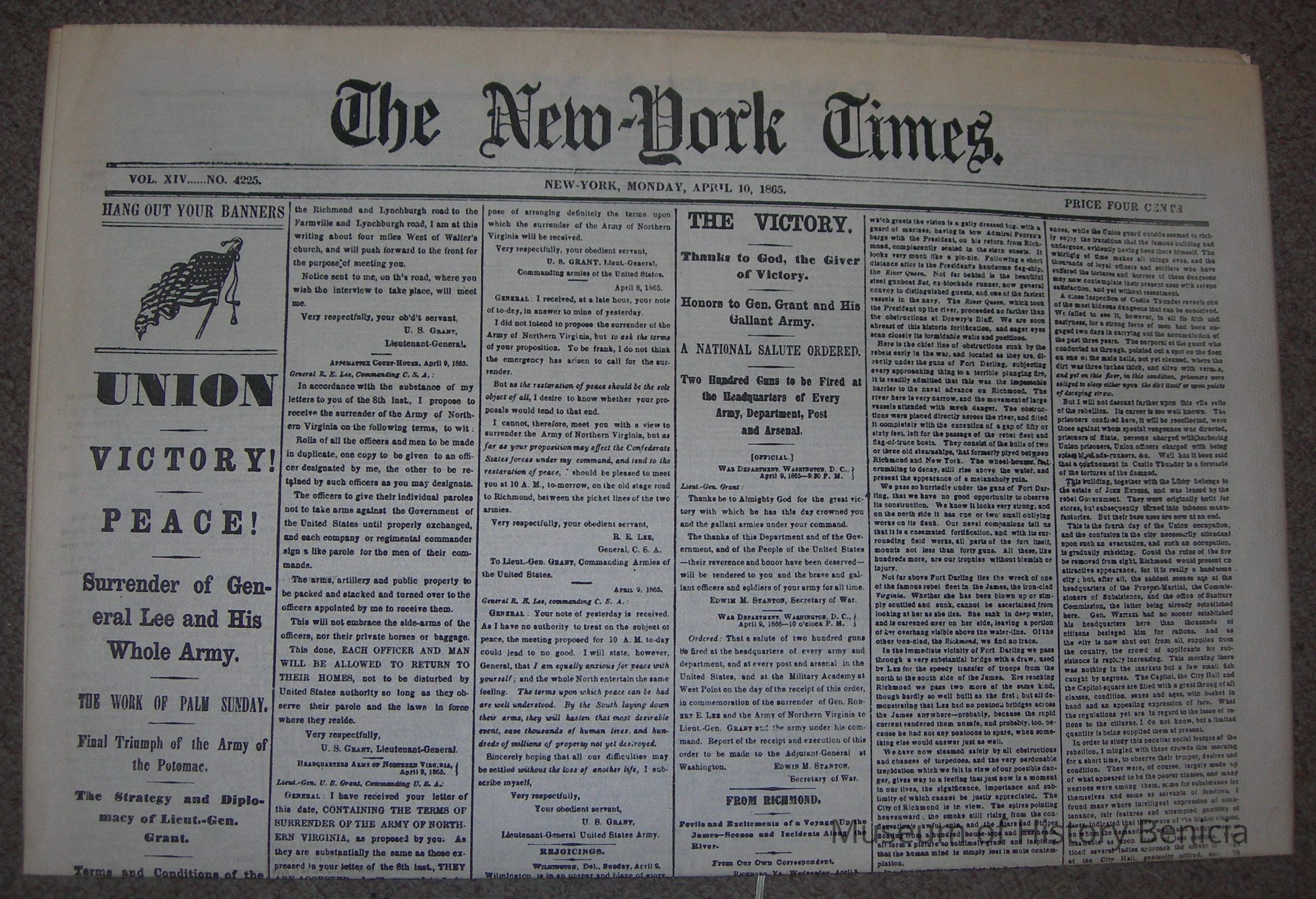 Reproduction The New York Times Monday, April 10, 1865 - Vol. XIV - No. 4225; price 4 cents "Union - Victory! - Peace!"