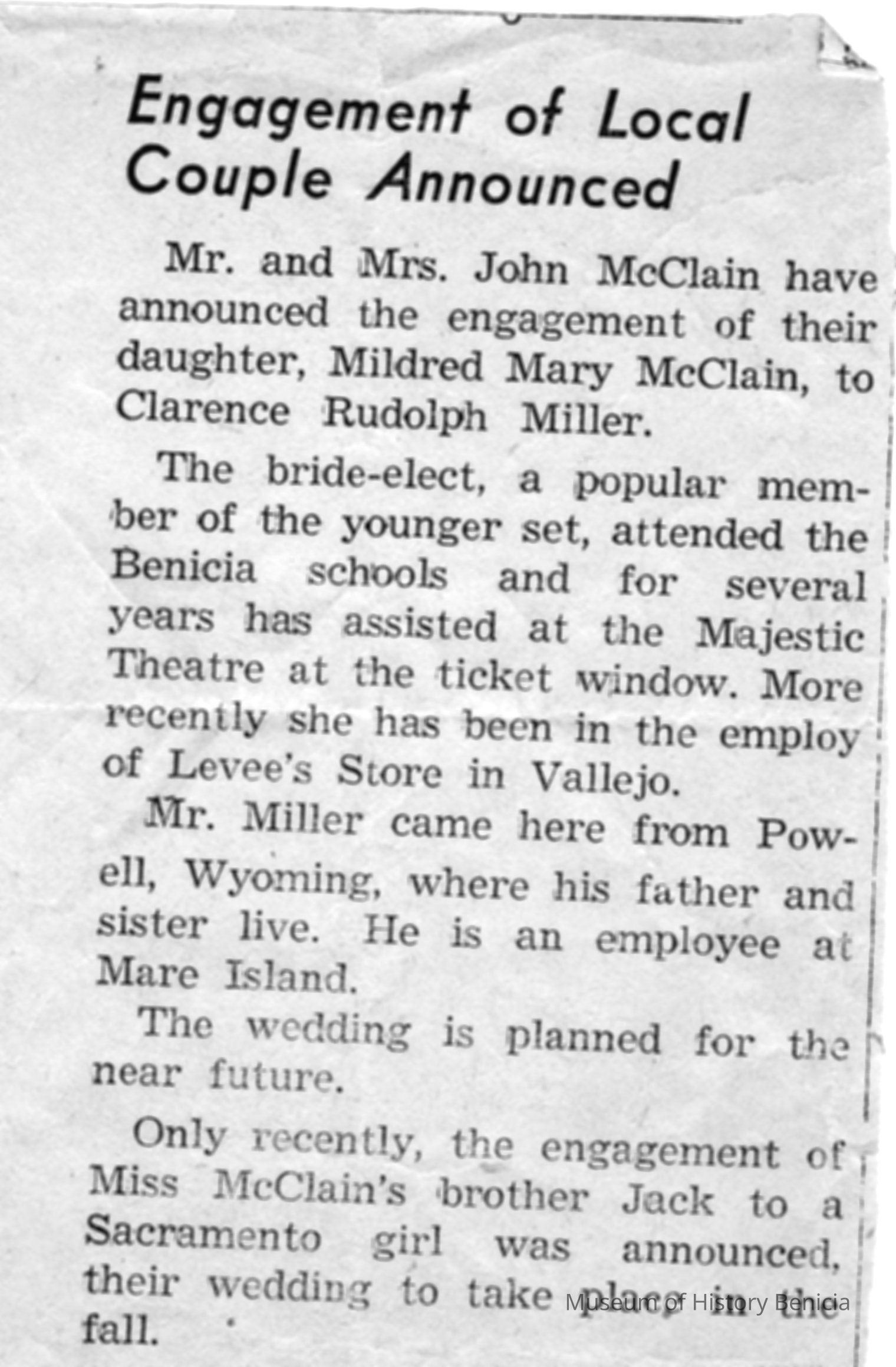 Newspaper article from newspaper of regarding the engagement of Mildred Mary McClain and Clarence Miller.