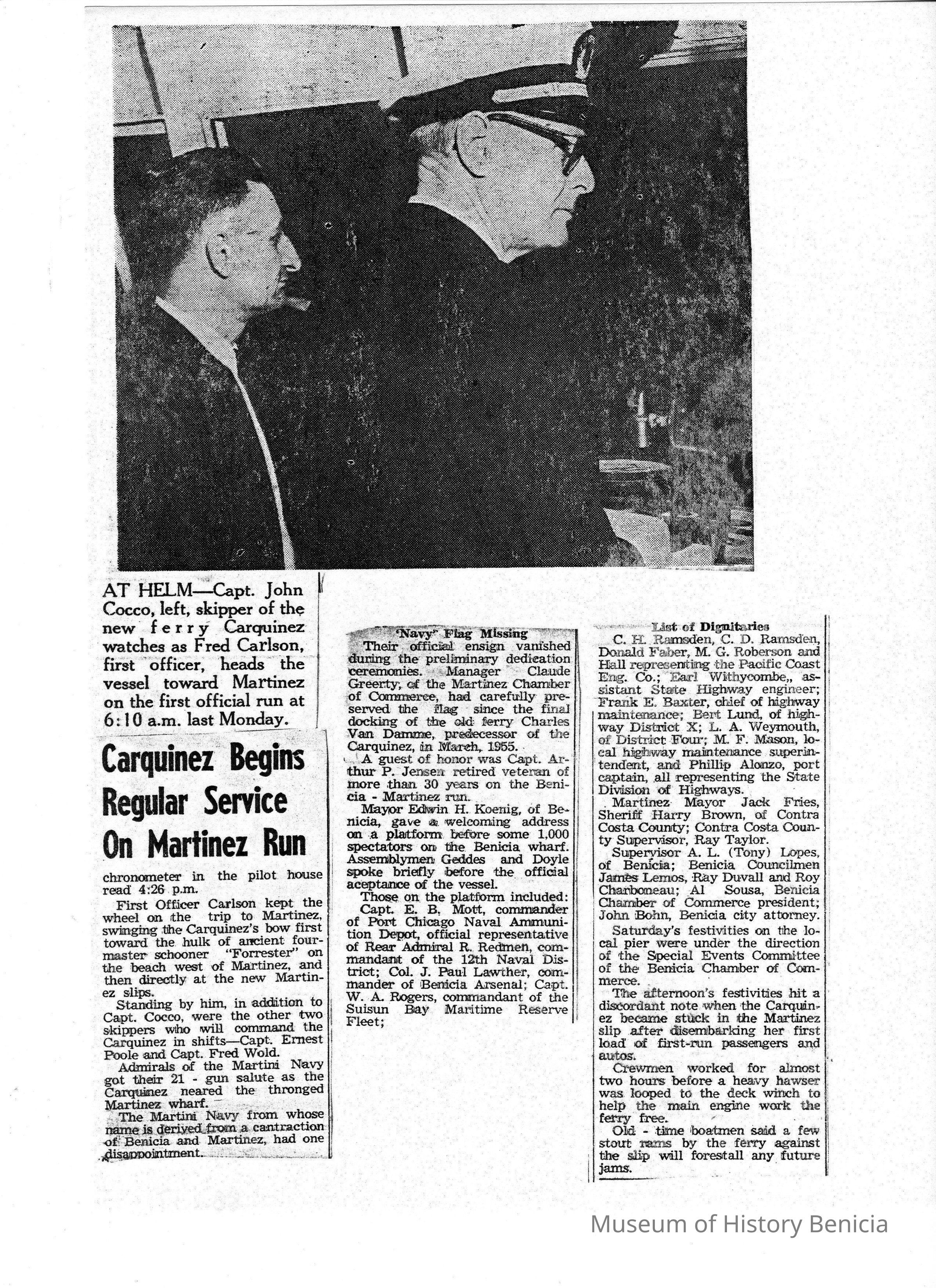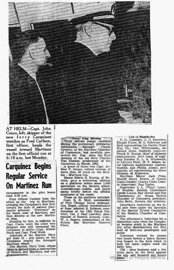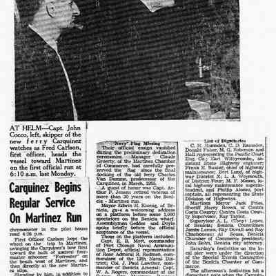 B/W photocopy of article and photo concerning the Carquinez's first run. Entitled "Carquinez Begins Regular Service on Martinez Run".