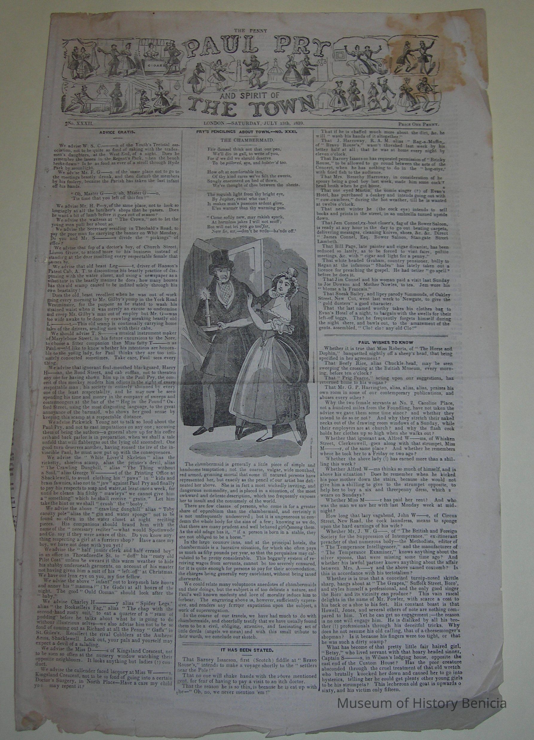 front sheet only. "The Penny Paul Pry and the Spirit of the Town/ No. XXXII/ London - Saturday, July 13th, 1839"