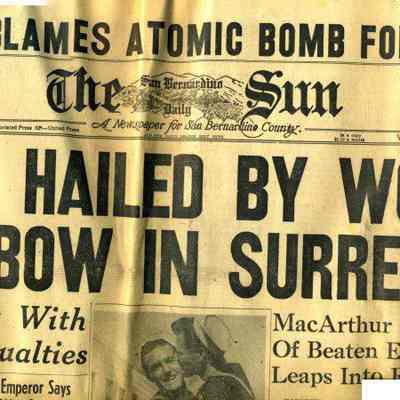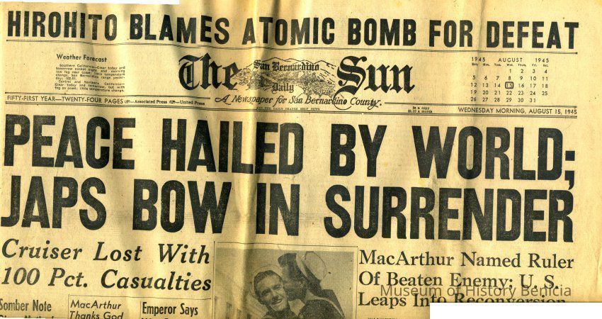 The San Bernardino Sun newspaper from 08/15/1945 with the headline "Peace Hailed by World". Has a photo of two very happy sailors.