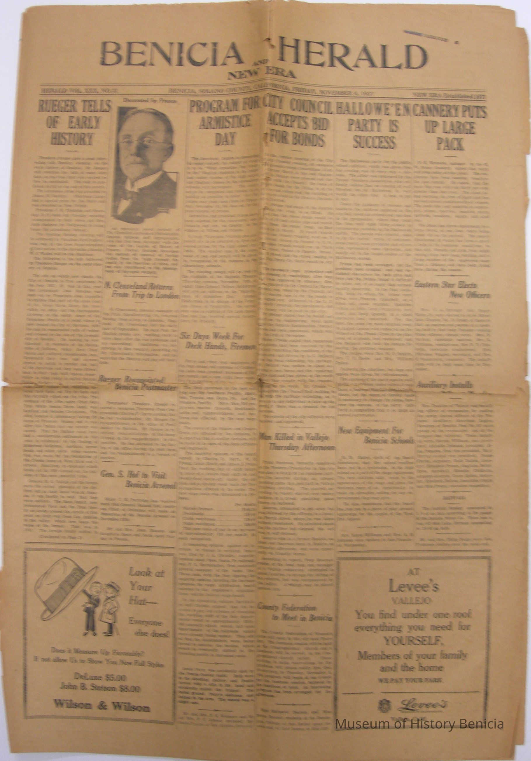 Benicia Herald Vol. XXX, No. 32, Friday, November 4, 1927. Article describes a speech Theodore Rueger gave on Benicia's early history.Collection