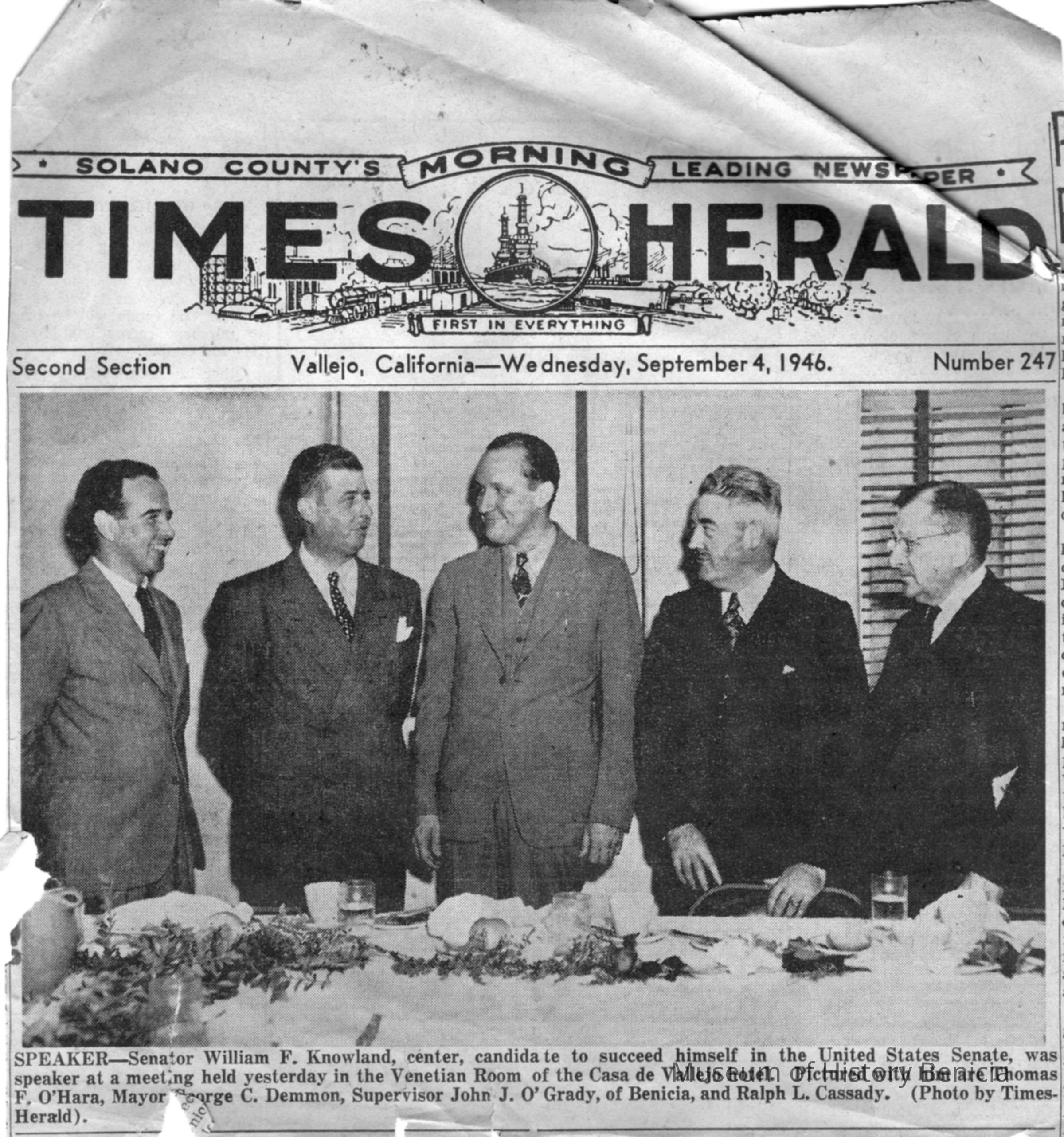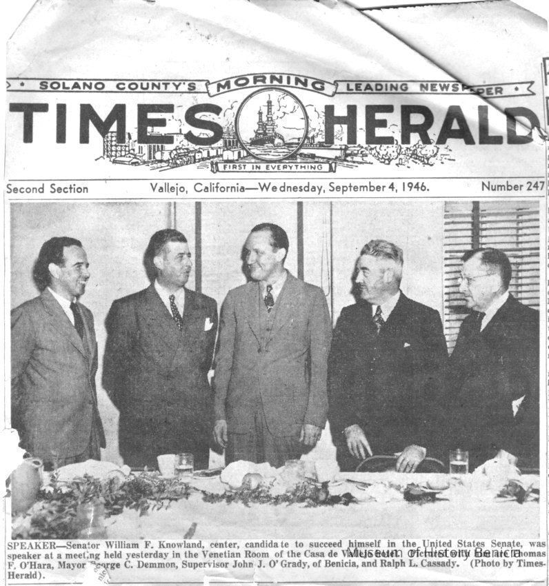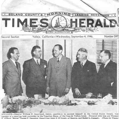 Newspaper article from Vallejo Times Herald dated 1946 regarding a meeting with Senator William F Knowland and local businessmen including Jack O'Grady. Meeting held in Vallejo.