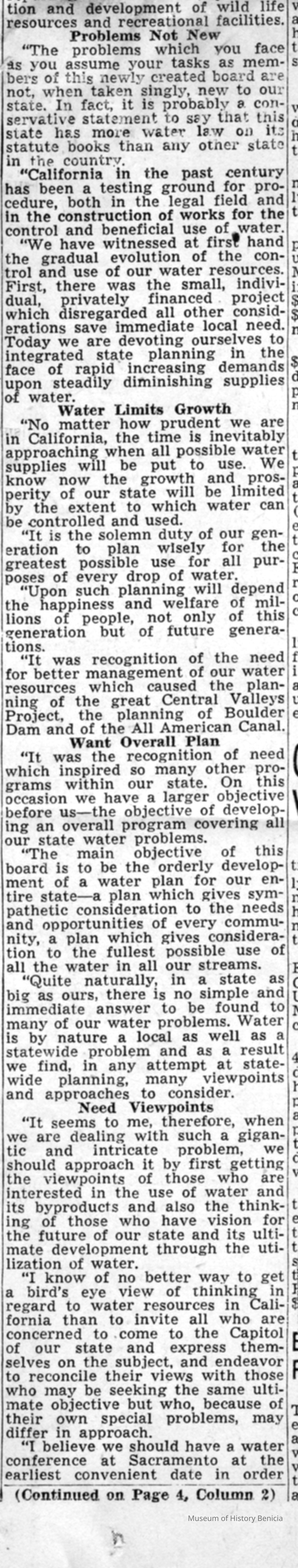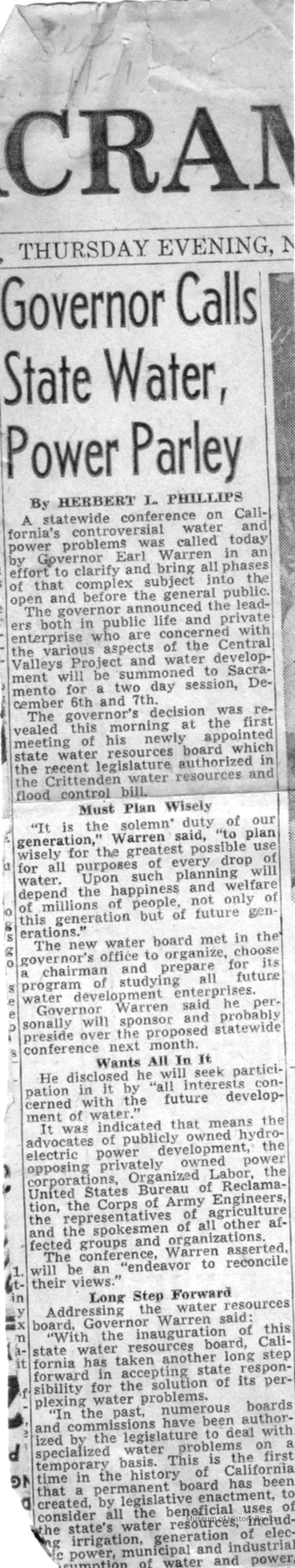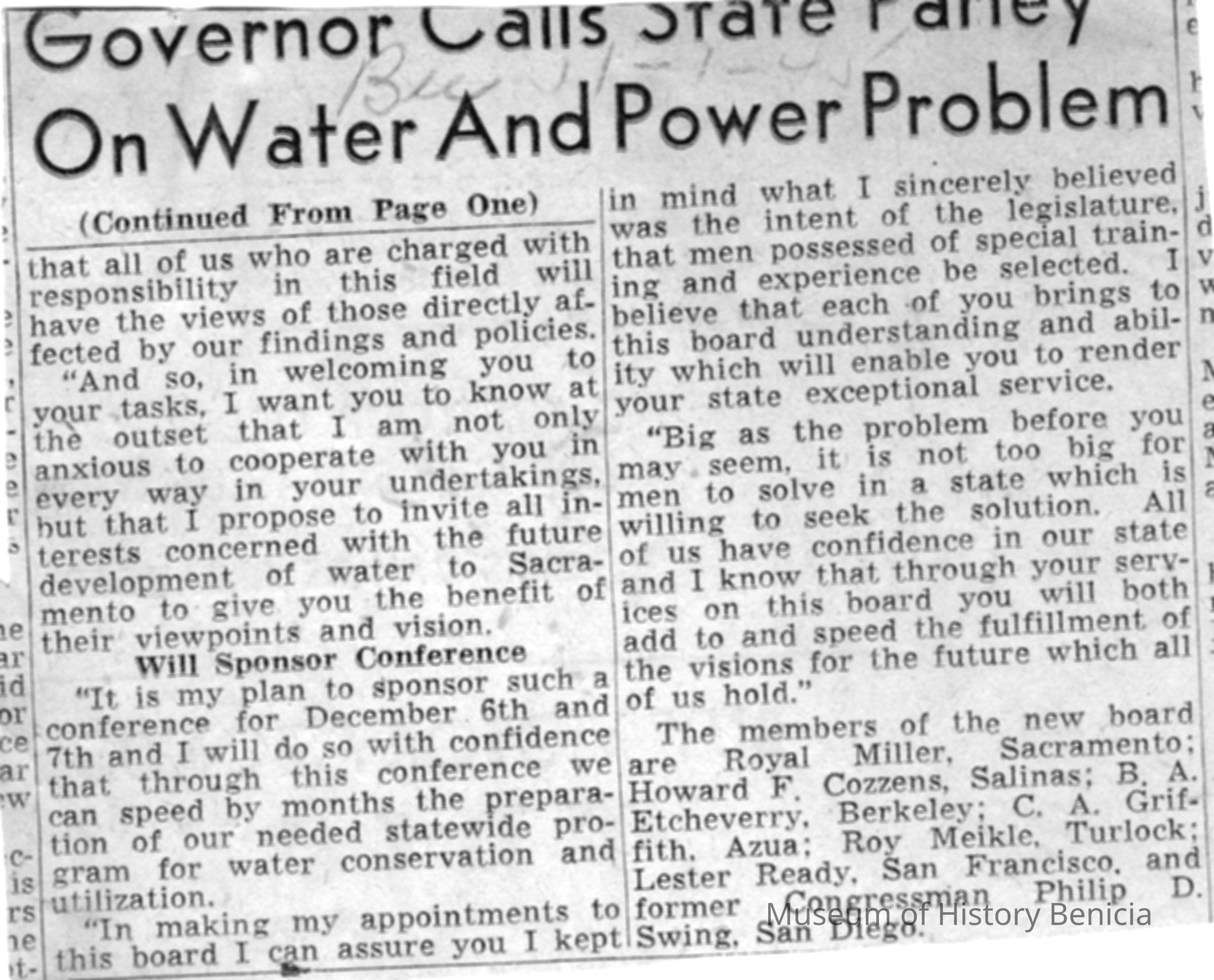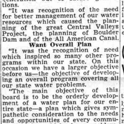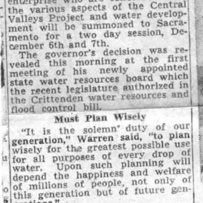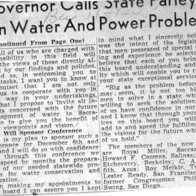 Another article from the Sacramento Bee dated 11/01/1945 on a meeting on California State Water, Power Parley.Collection