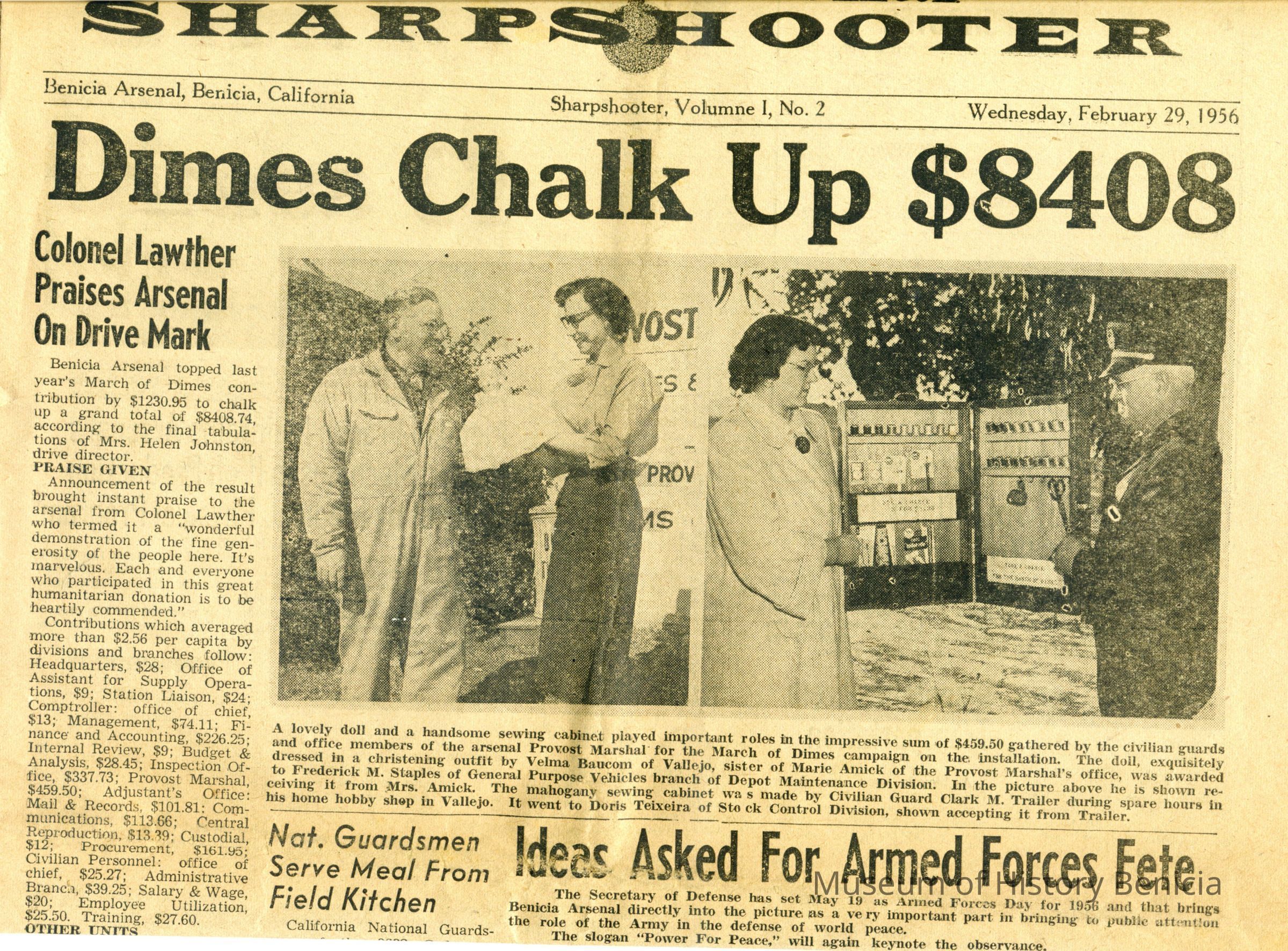 This is a Sharpshooter newspaper from Benicia Arsenal for February 29, 1956 Vol I - No 2.